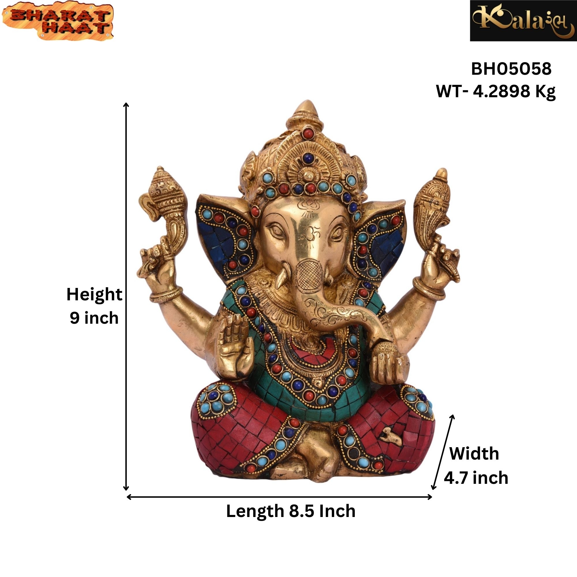 Elegant medium brass sitting Ganesh adorned with intricate stone work, ideal for puja or decorative display.