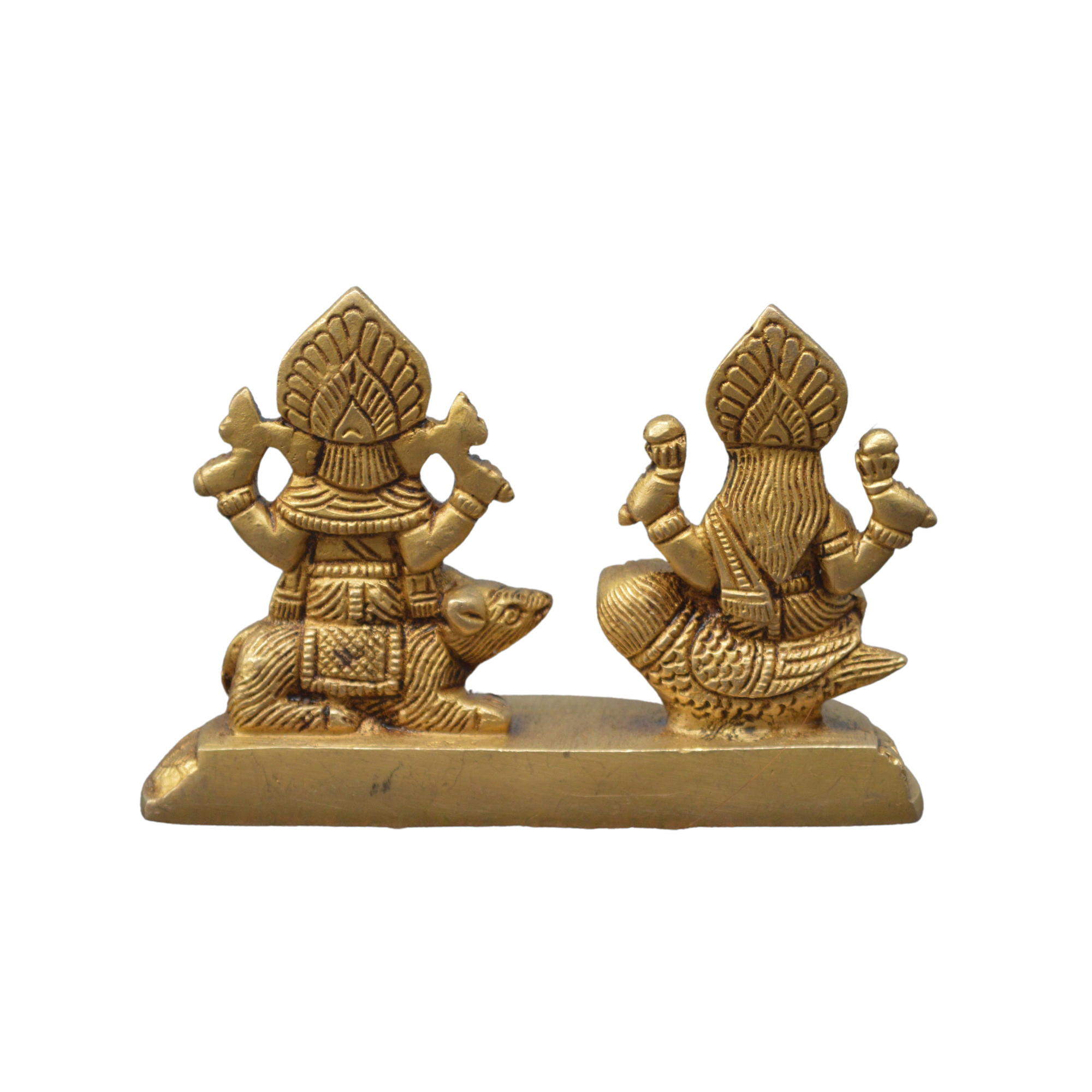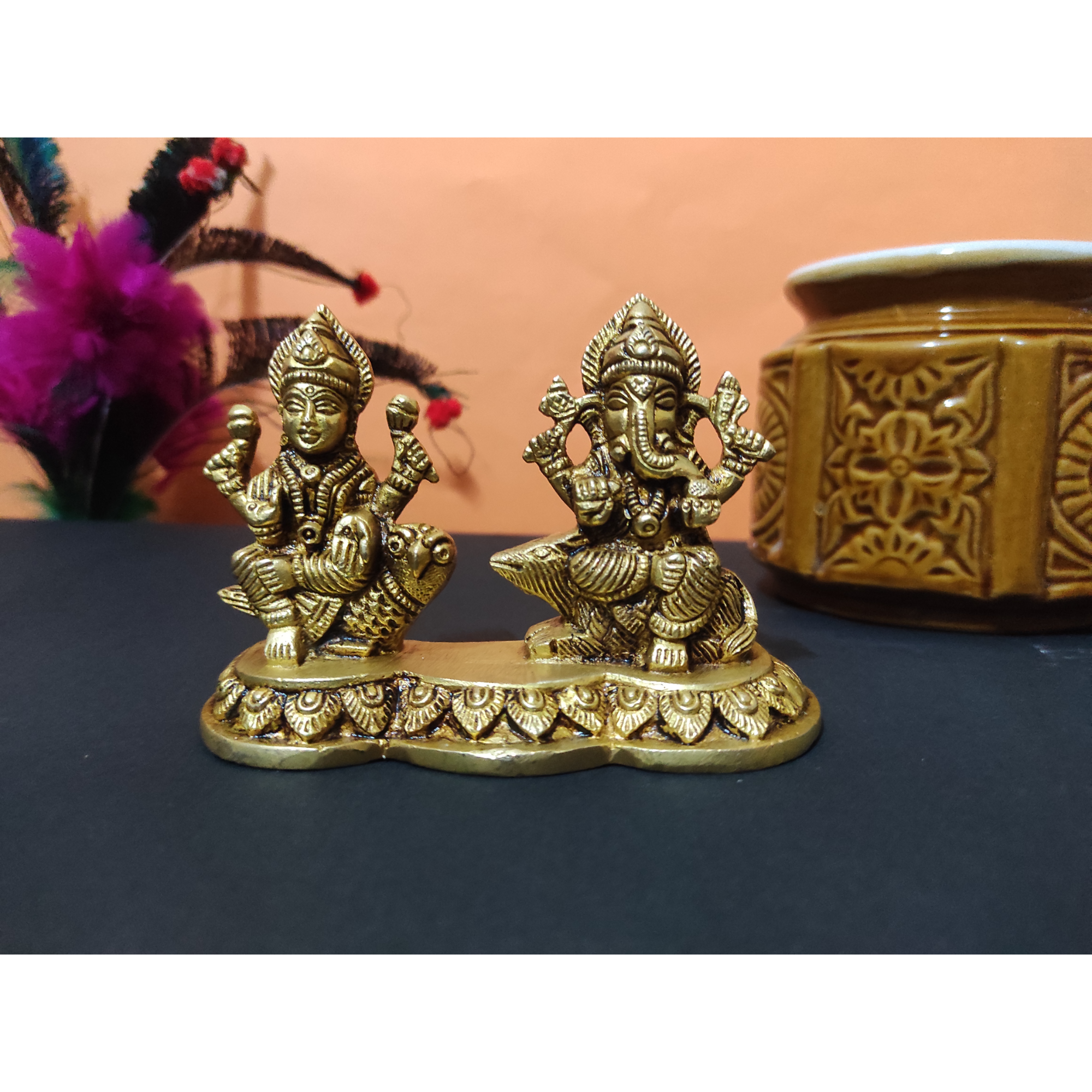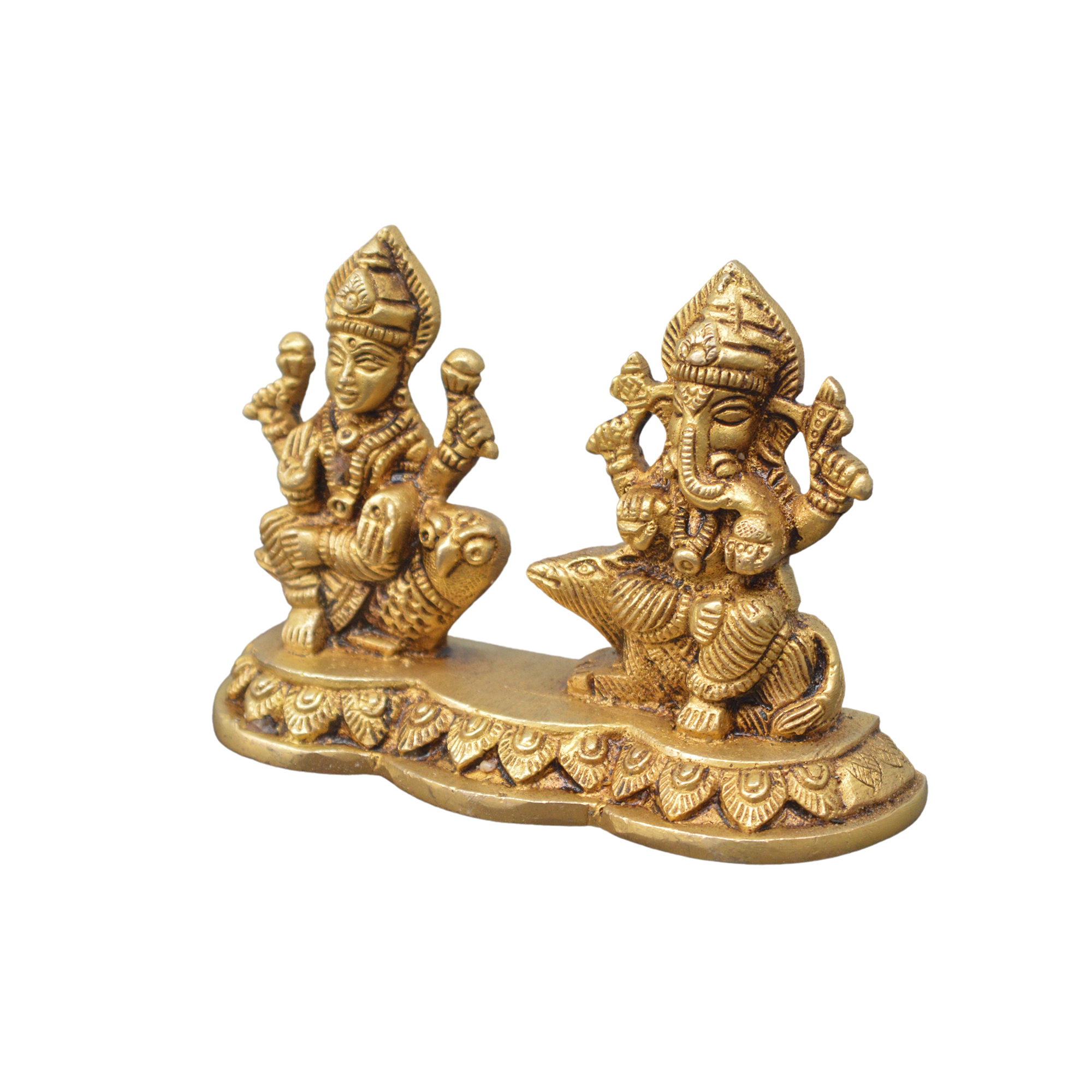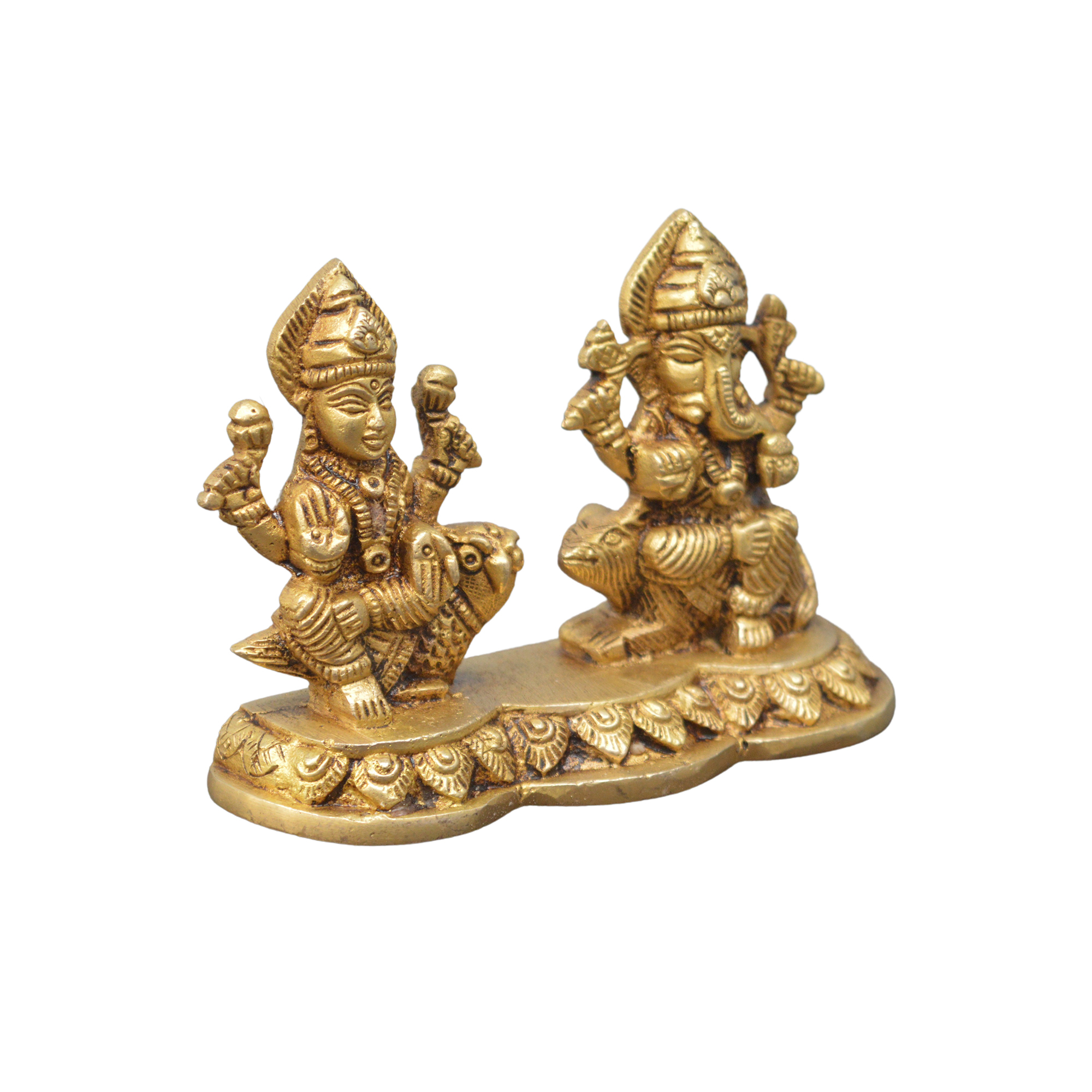 Design: Handcrafted brass idol featuring Lord Ganesha alongside Goddess Laxmi with intricate detailing
