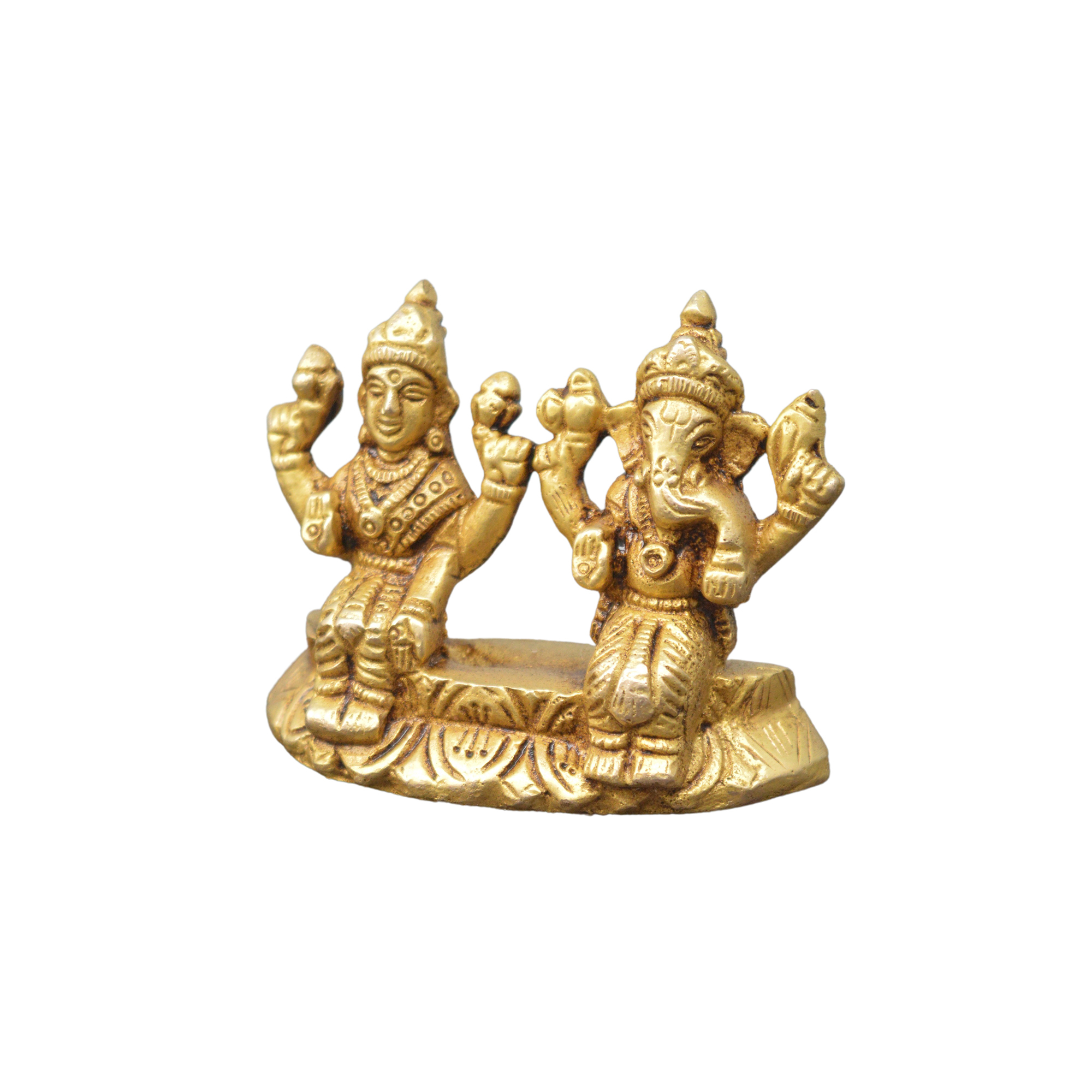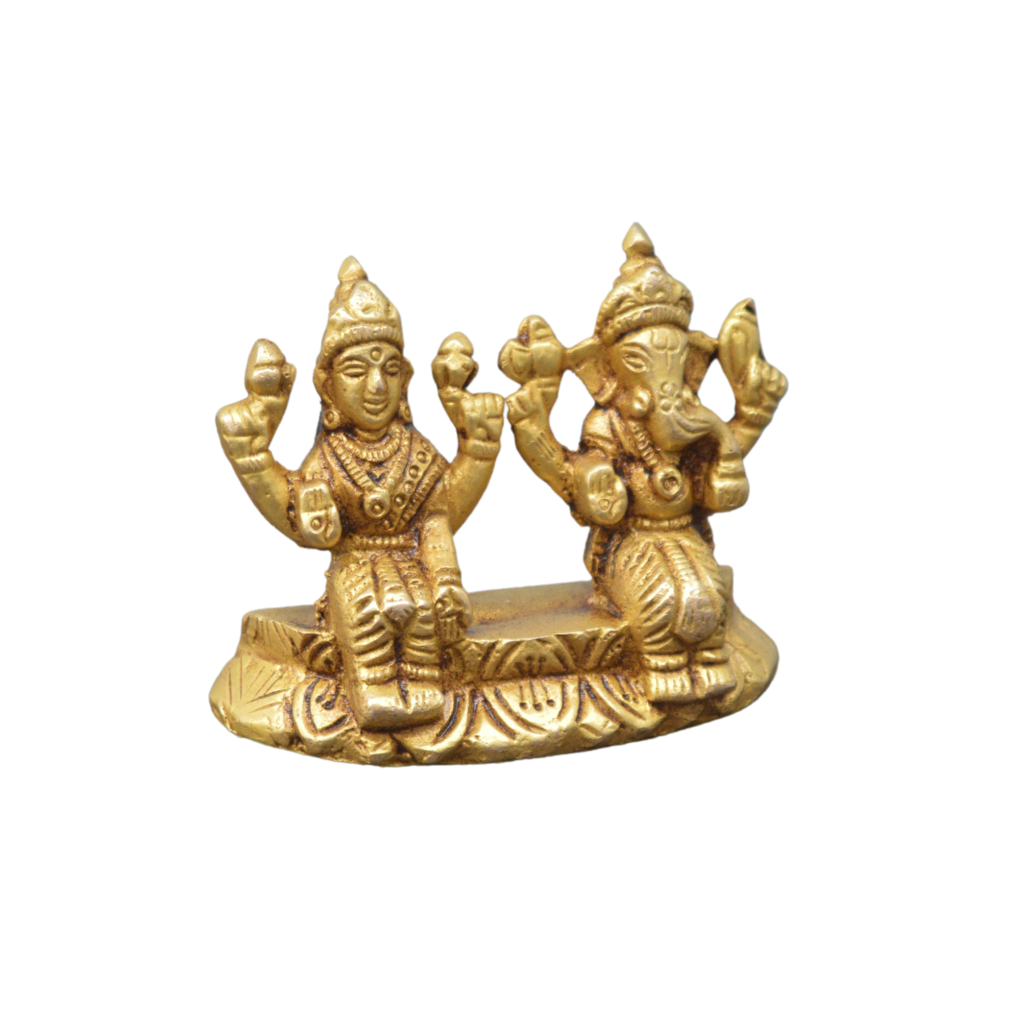 Small Brass Ganesh Laxmi idol with intricate craftsmanship. Ideal for home puja, gifting, or as a decorative piece.