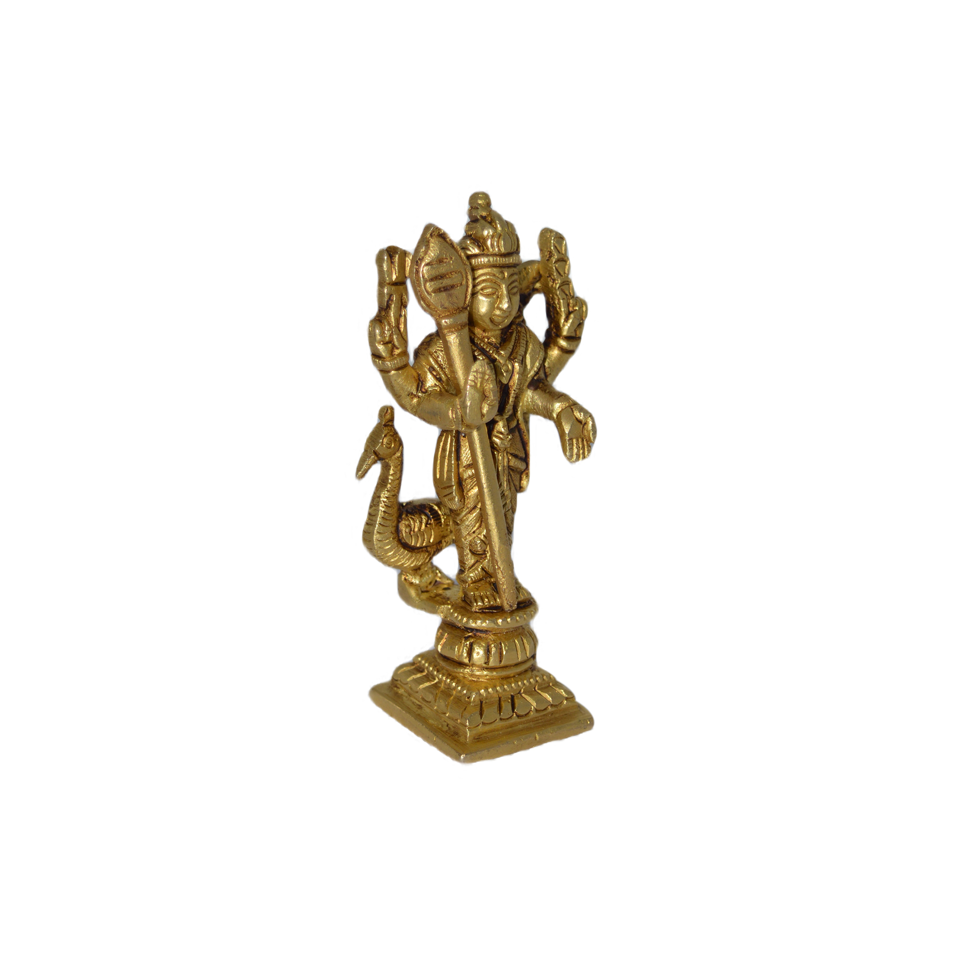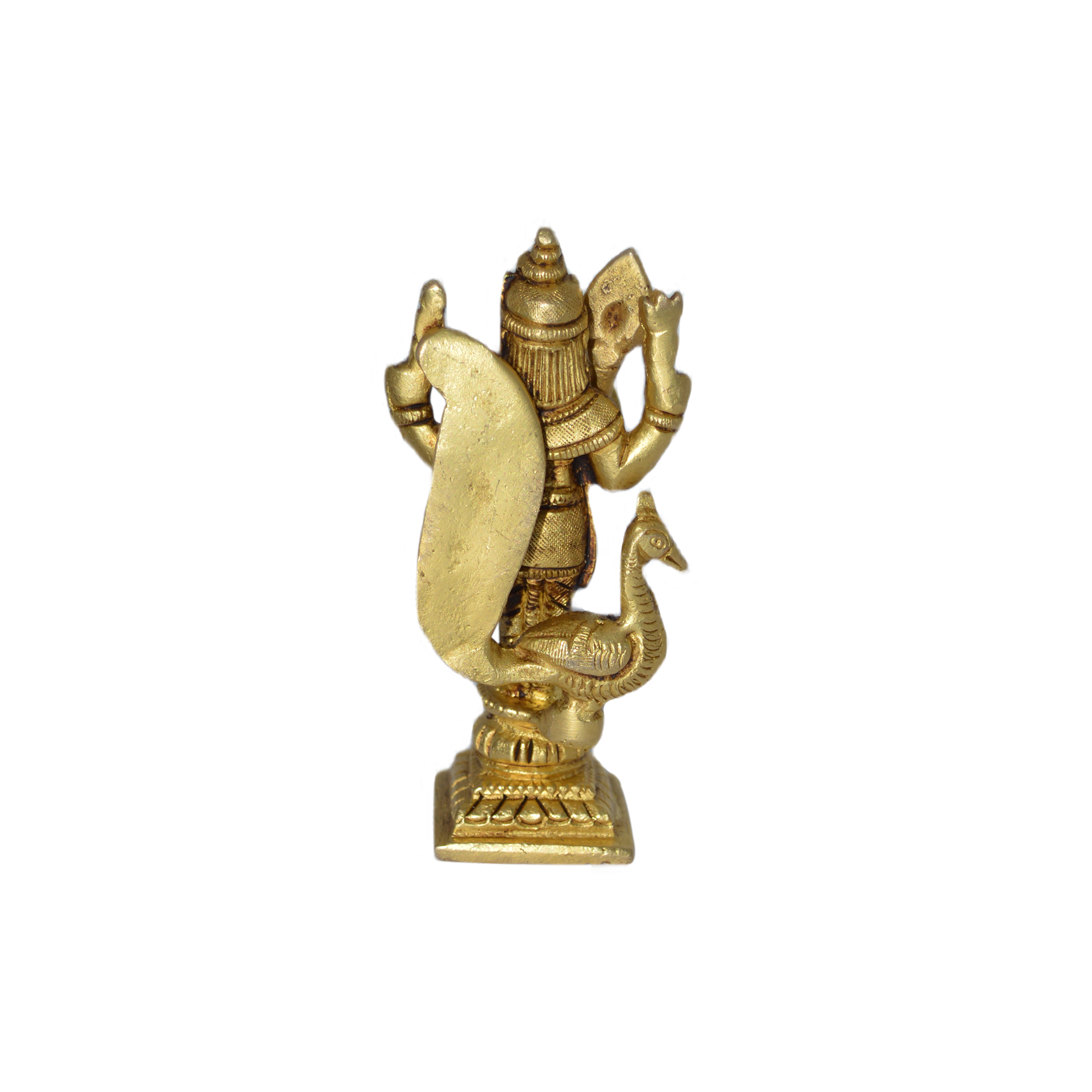 Design: Handcrafted brass idol of Lord Kartikeya with detailed carvings of posture, weapons, and ornaments