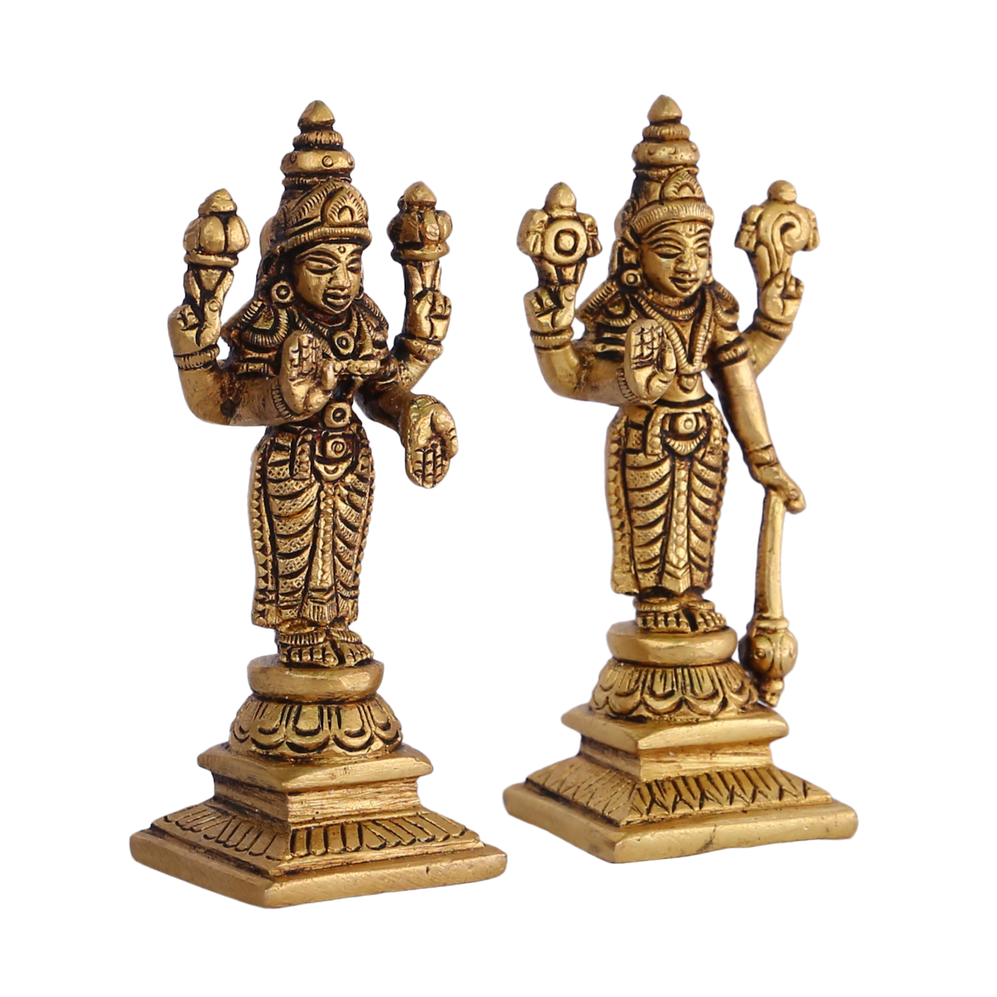 Beautifully crafted Brass Vishnu Laxmi idol set with intricate detailing. Perfect for pooja, home décor, or spiritual gifting.