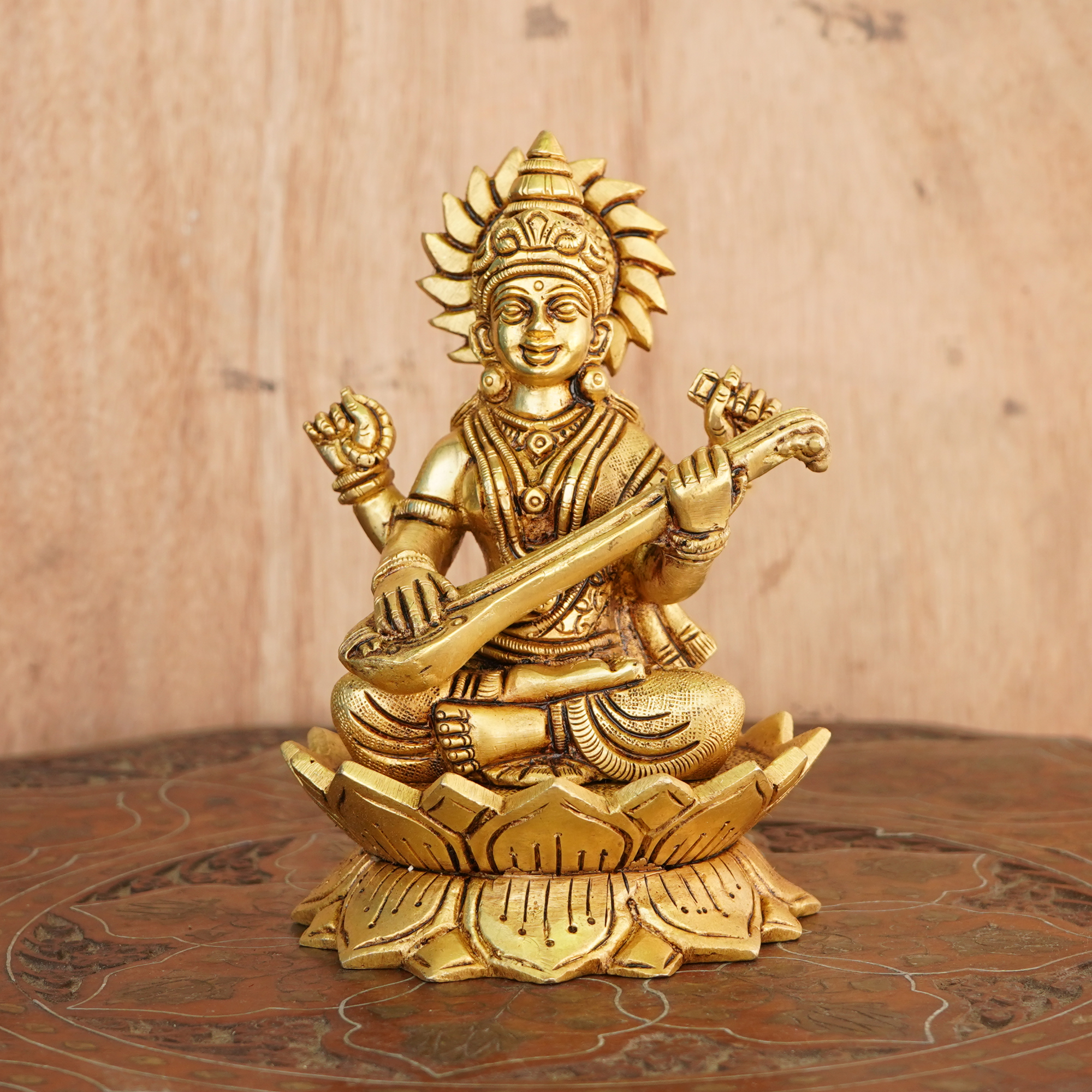Design: Features Goddess Saraswati seated on a lotus, symbolizing knowledge, wisdom, and prosperity. Intricate carvings highlight her veena, ornaments, and serene posture, making it a visually stunning and auspicious centerpiece