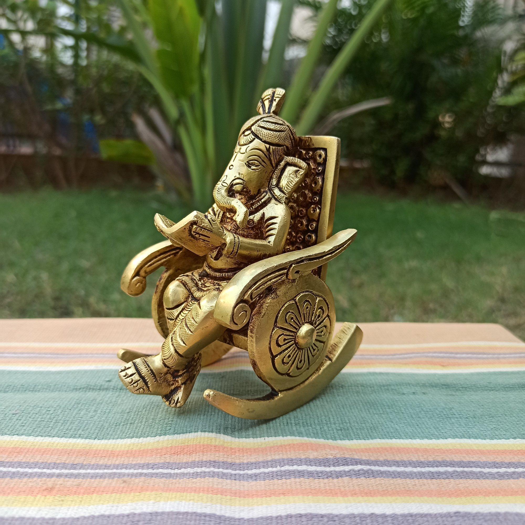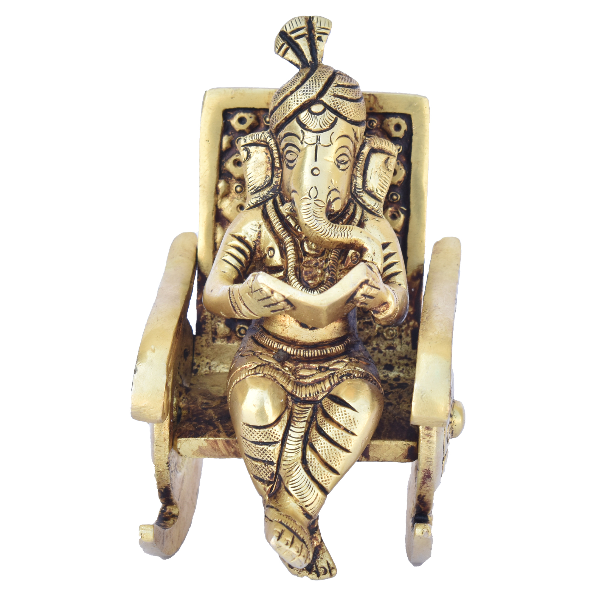 Design: Features an intricately designed Lord Ganesha sitting on a regal chair, with detailed carvings of his elephant head, trunk, hands, and attire