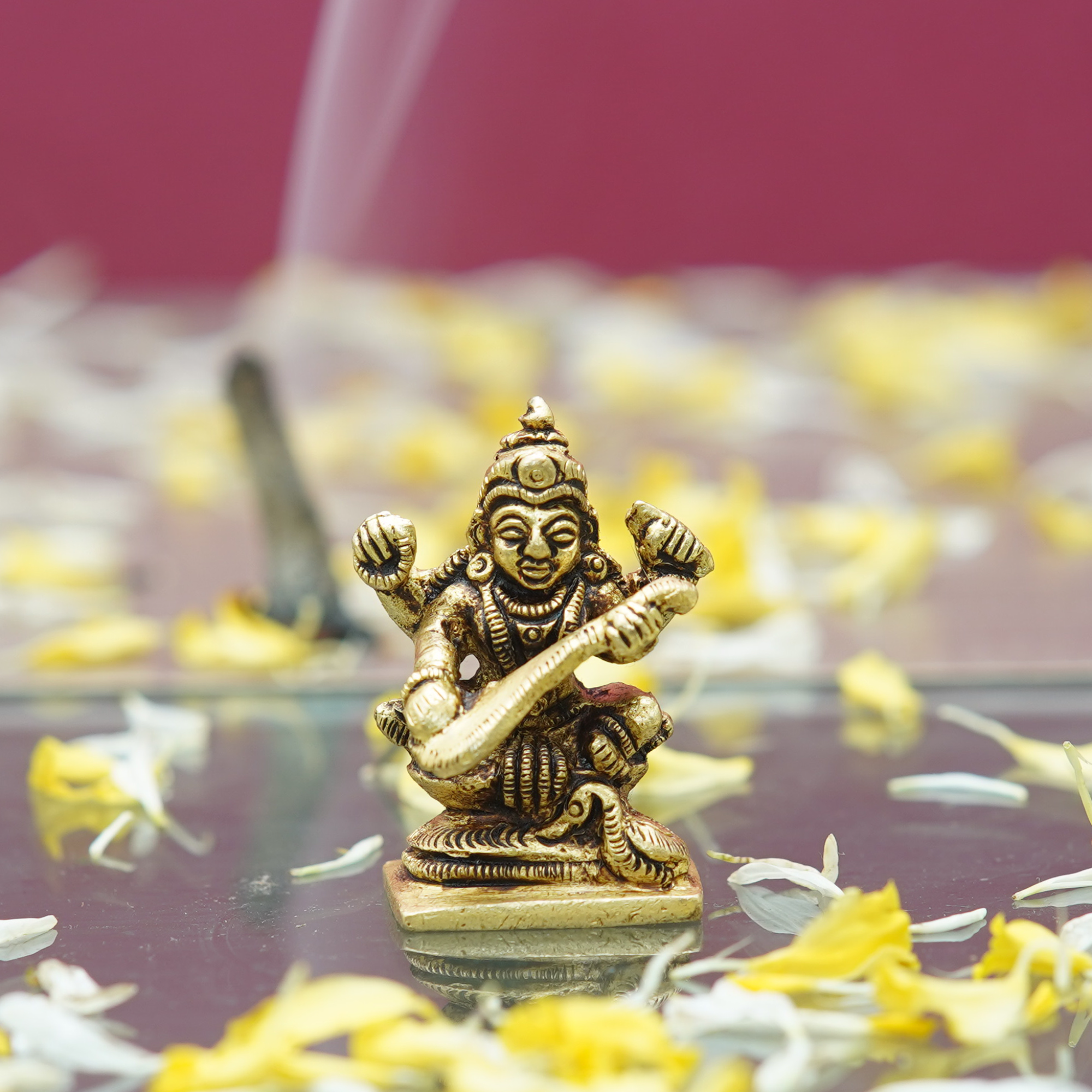 This Brass Saraswati idol measures 1.1 x 1 x 2 inches (2.79 x 2.54 x 5.08 cm) and weighs 86 grams. Expertly handcrafted, this statue of Goddess Saraswati represents wisdom, learning, and arts. Ideal for pooja rituals, home temples, or gifting, it brings divine blessings and spiritual energy to your space.