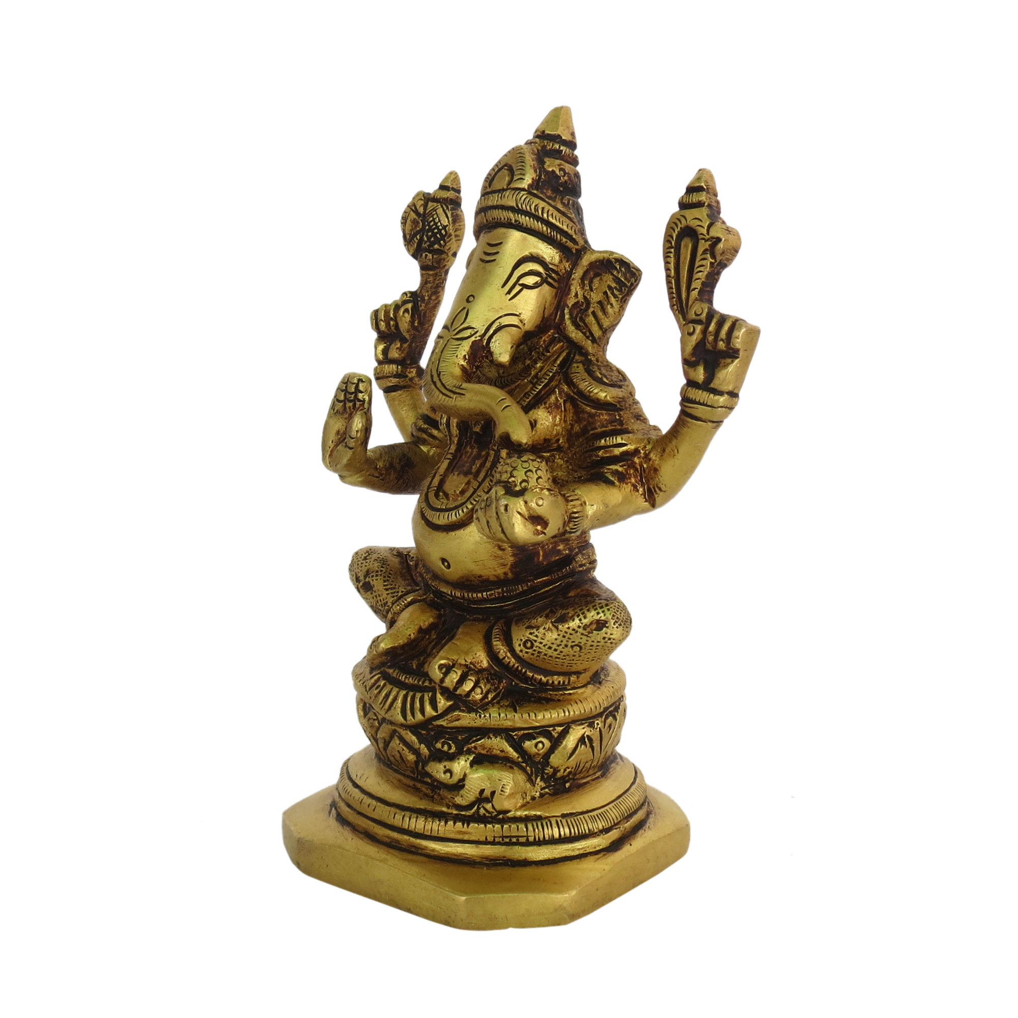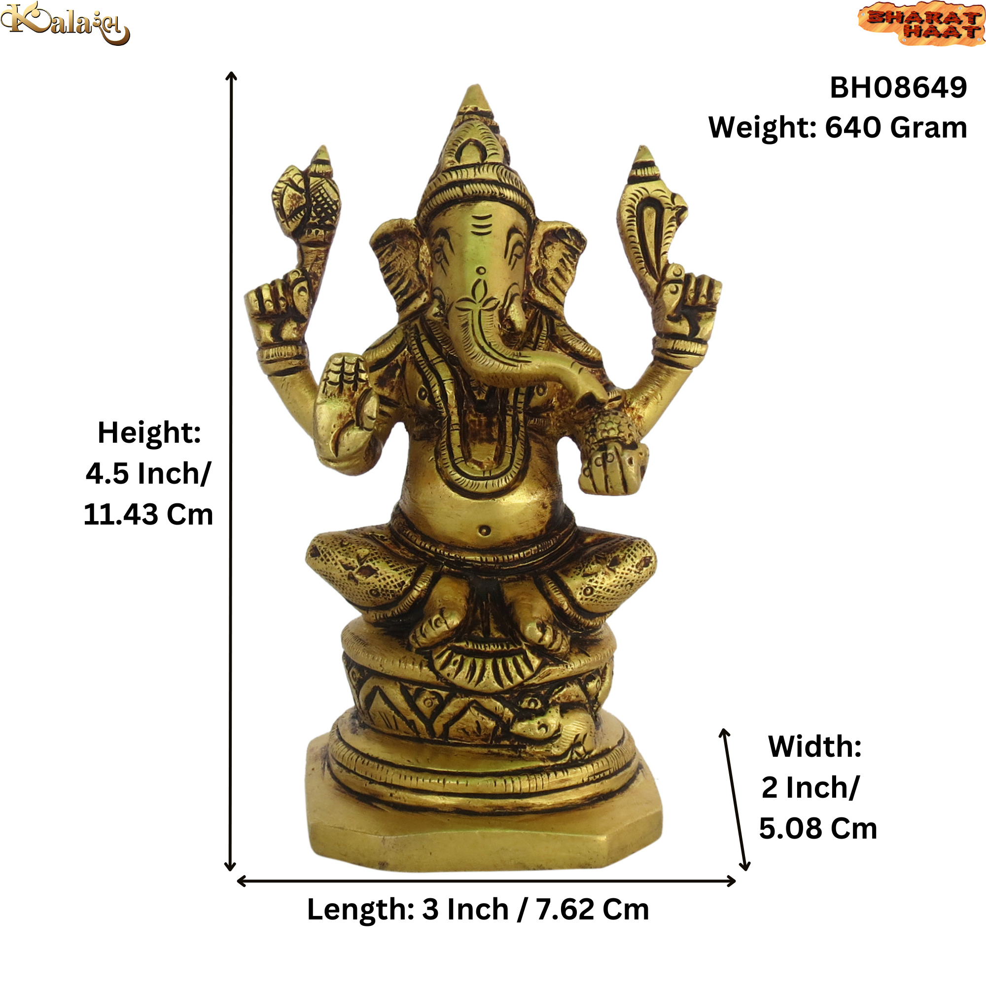 This exquisite Brass Ganesh idol depicts Lord Ganesha in intricate detail. Made from high-quality solid brass, it stands 4.5 inches tall and weighs 640 grams, ideal for home temples, sacred spaces, or as a spiritual gift.