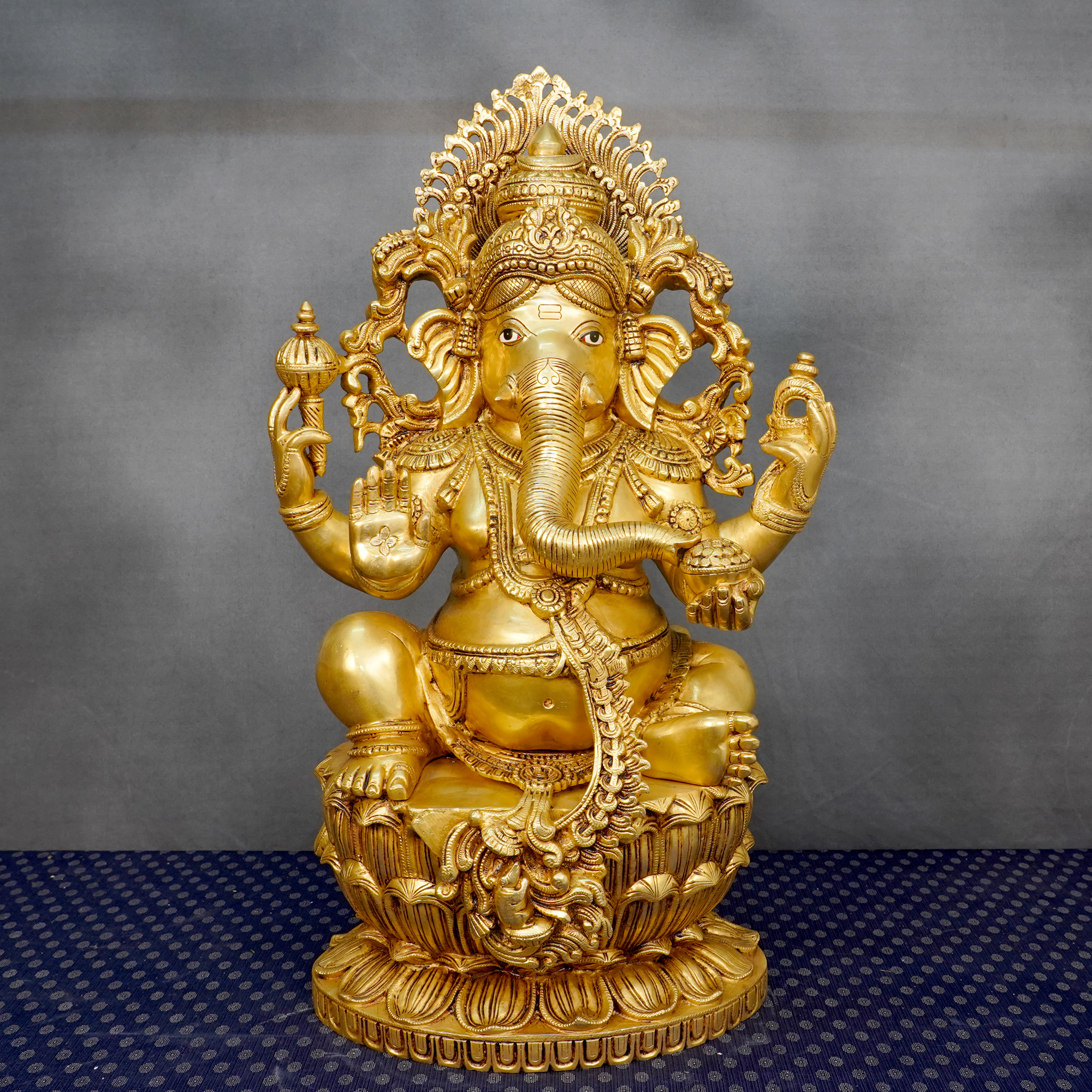 Majestic Brass Ganesha statue, 1 Pc, size 15 x 8.5 x 26 Inch, 34.64 Kg. Ideal for home altars, large spaces, or as a striking spiritual centerpiece.