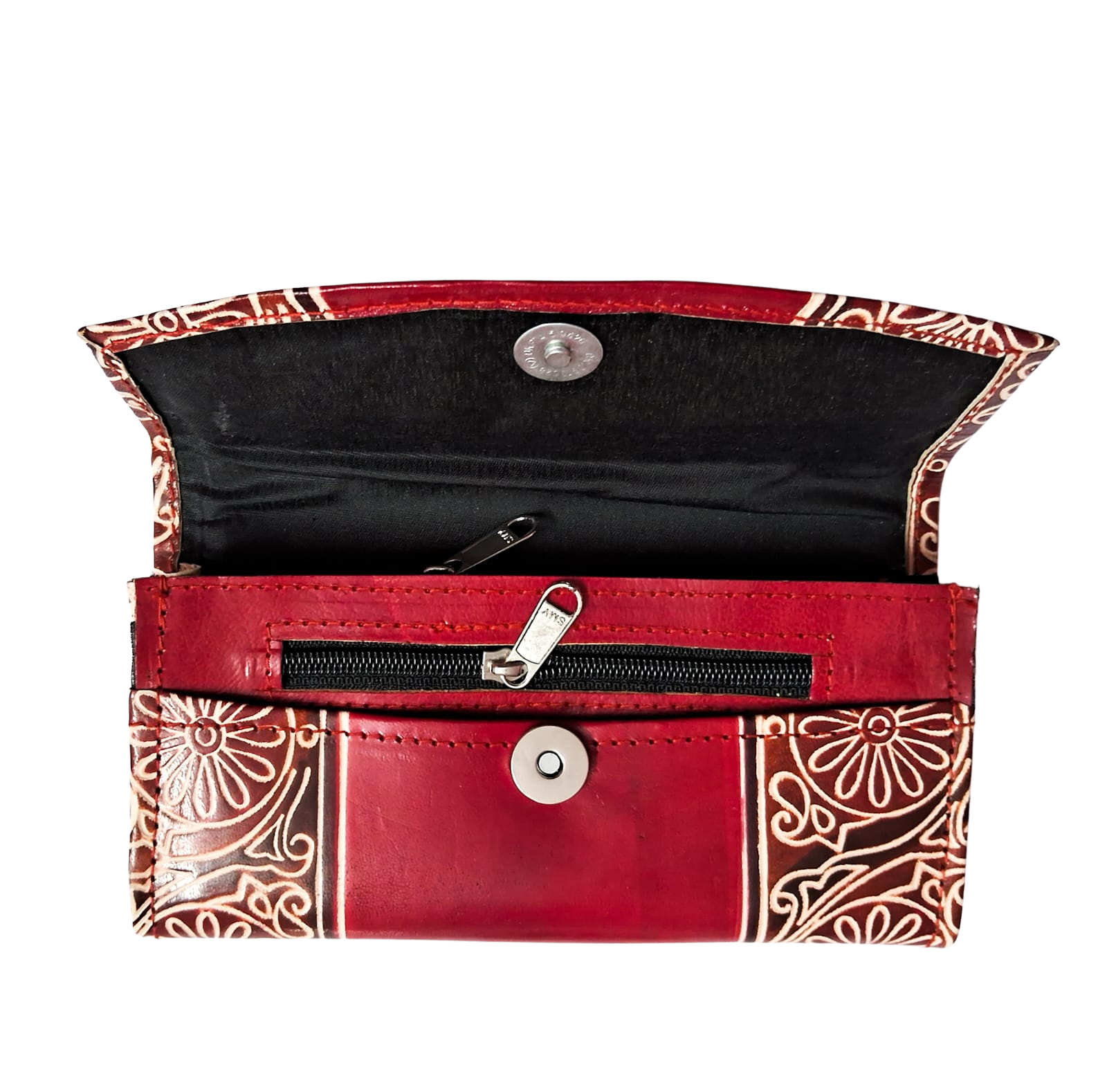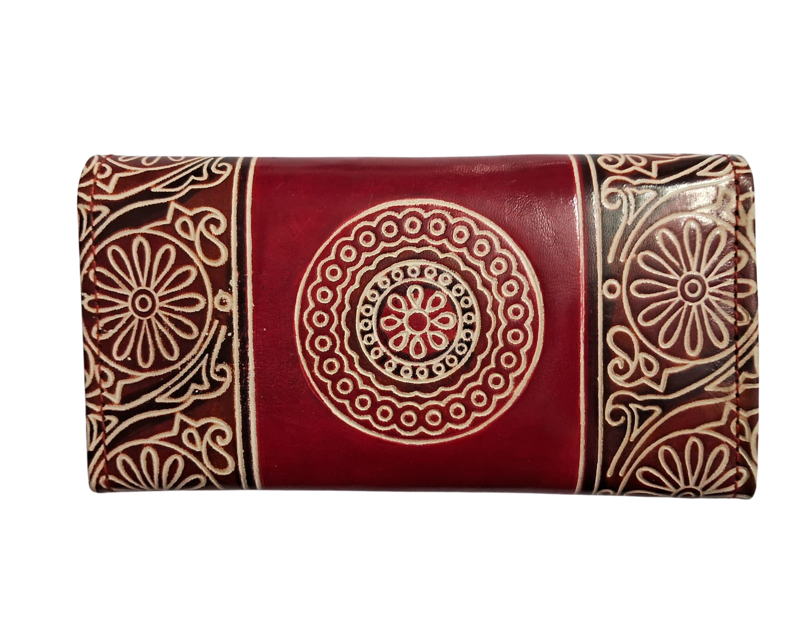 This purse is a classic example of age old Shantiniketan craft. It was introduced in West Bengal, India during the 1940s. The traditional motifs used for These Shantiniketan bags depict the rich cultural heritage of India. It derives its name from the place where it was first introduced – Shantiniketan. The Shantiniketan style evolved as a result of the Art Movement. These products have now become world famous for their applique, batik and embossed craft work. Moreover the process of burnishing the leather gives it an elegant sheen and brings out the colors. The embossing craft is an intricate process. After the final leather is made, it is then stitched into the desired product . Finally the product is coated with a lacquer finish for making the product shiny and long lasting.