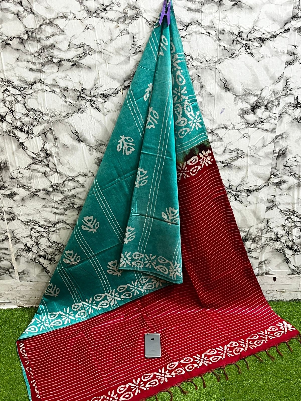 The traditional Batik print adds a handcrafted charm, while the golden zari border elevates the overall richness of the saree.
