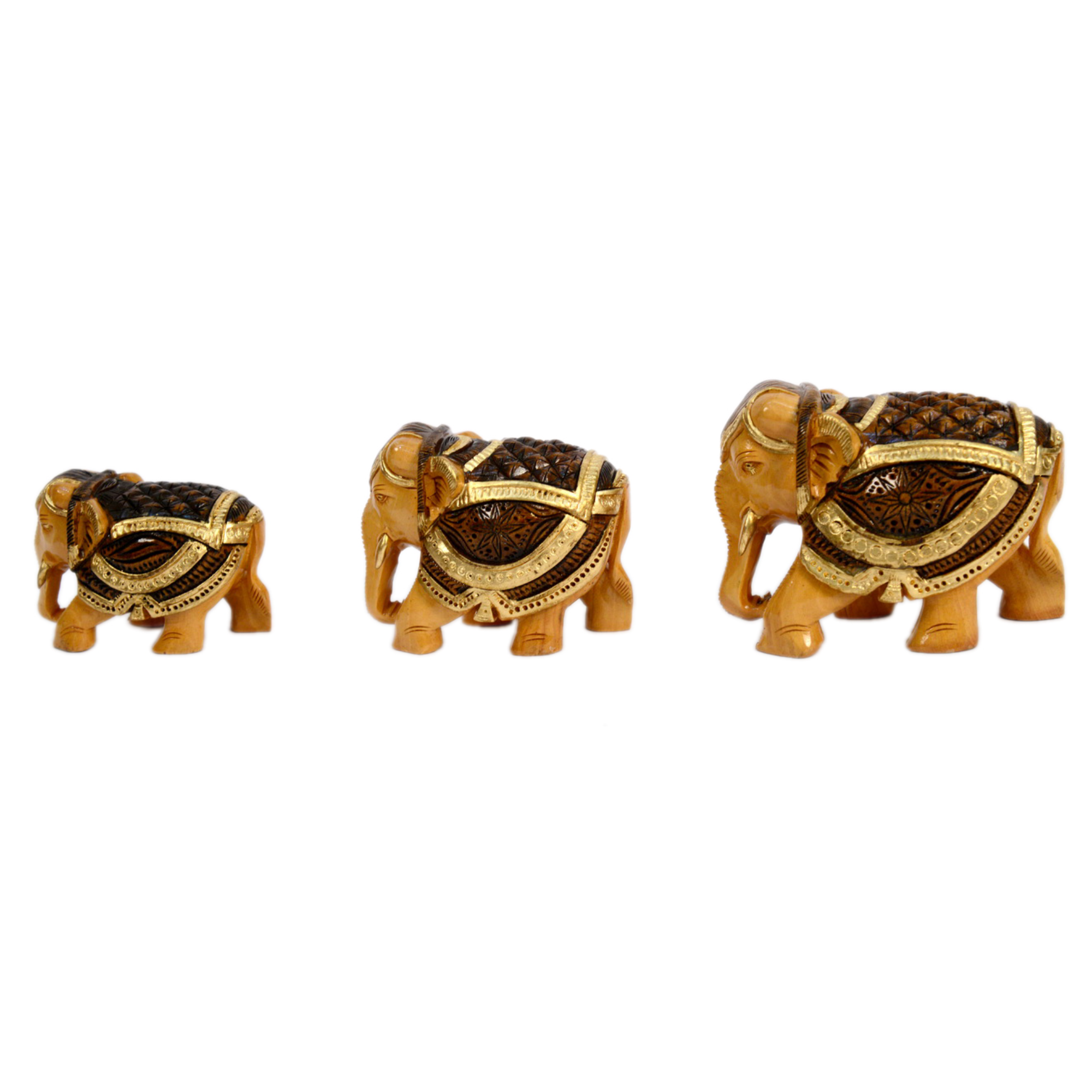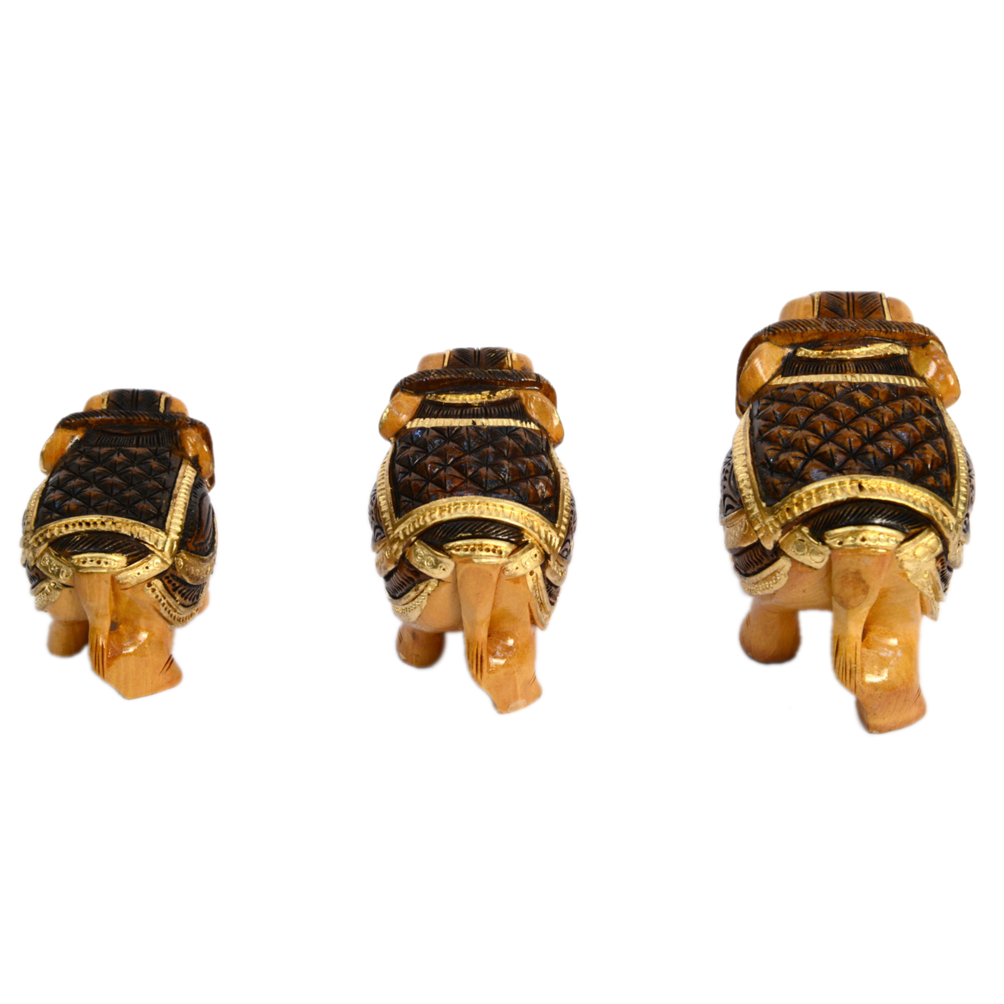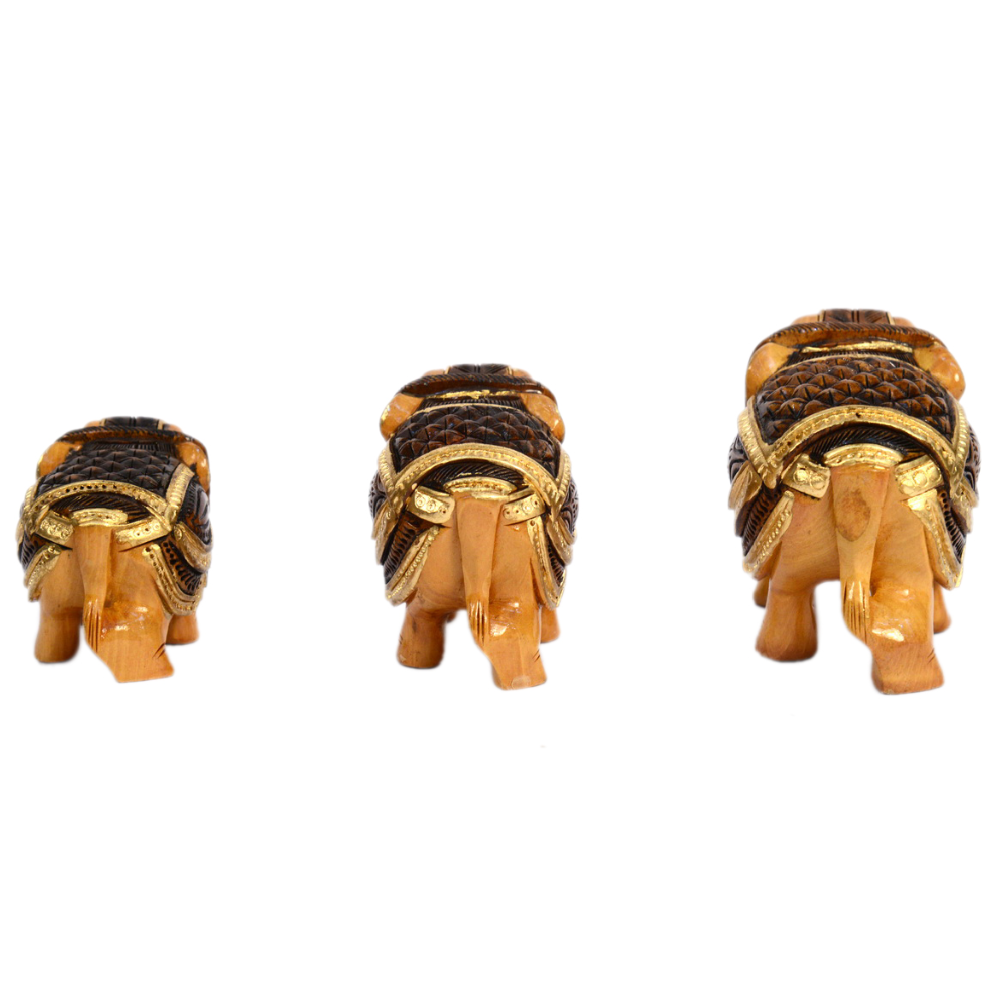 Handcrafted Wooden Elephant Set with Golden Painting – 3 Piece Decorative Elephant Figurines