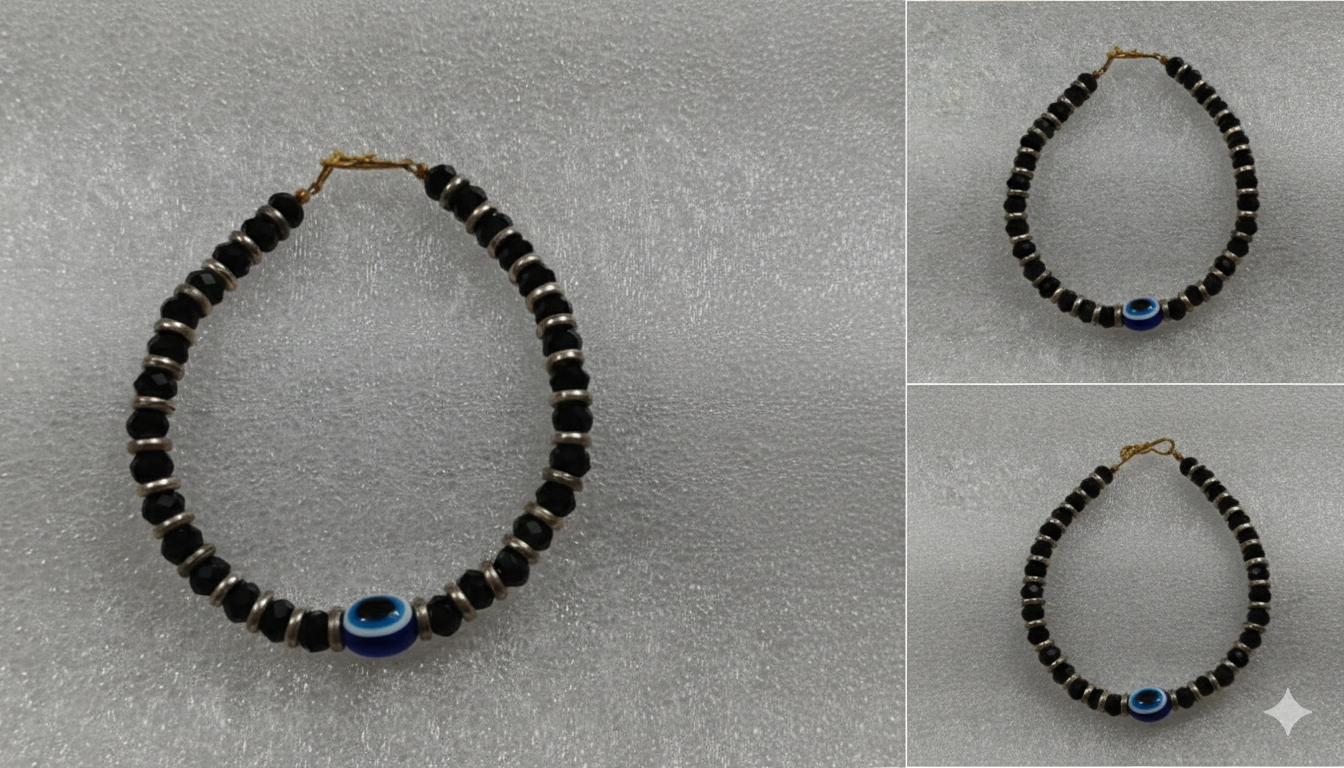 - Design: Dual-strand design featuring classic black beads and central blue Evil Eye (Nazar) charms.