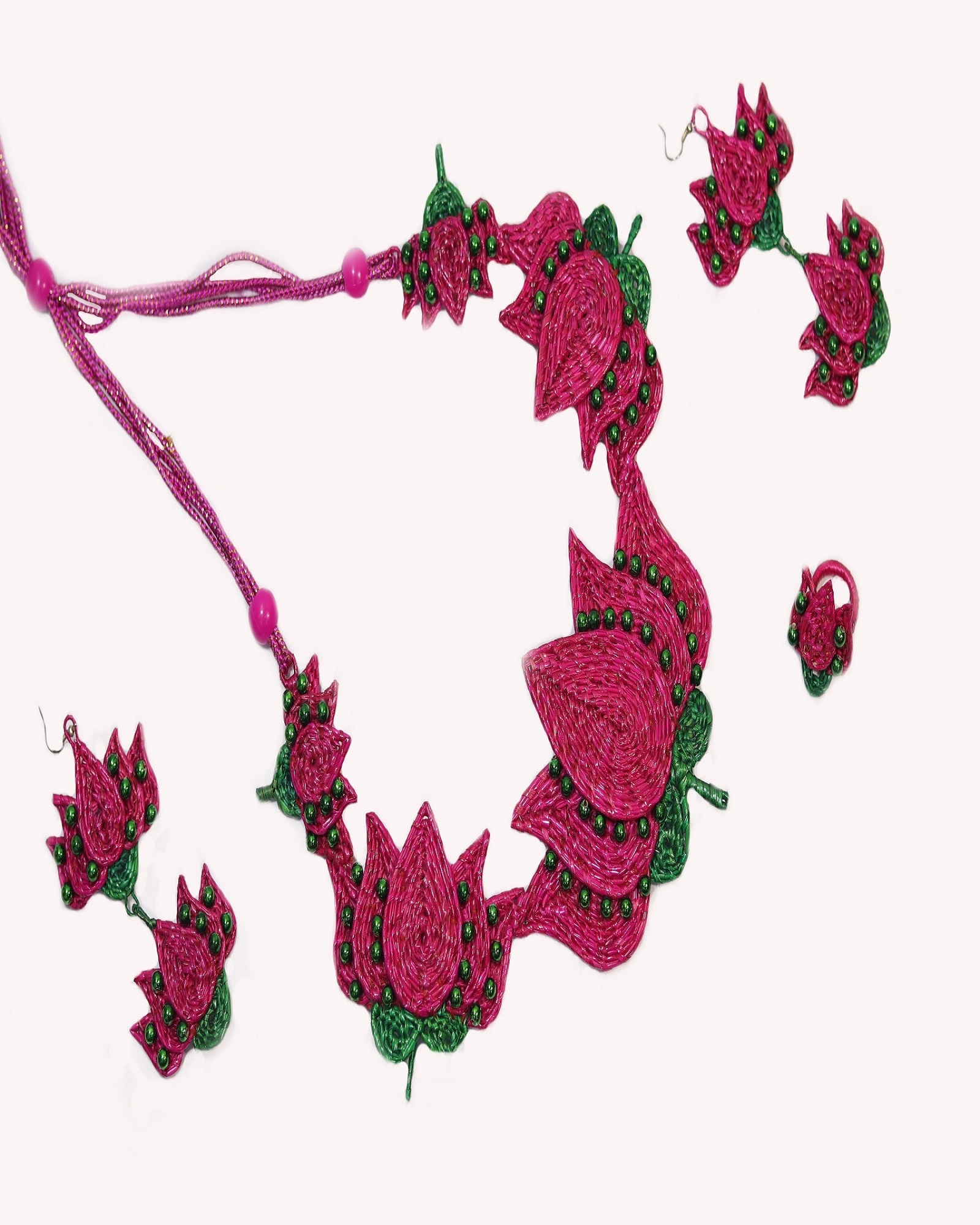 Handmade sikki necksets are traditional jewelry pieces crafted from sikki grass, a golden-hued wild grass native to Bihar, India. Artisans weave the grass into lightweight, coiled necklaces, often dyed in vibrant colors for an eco-friendly and auspicious accessory. These sets embody Madhubani region's cultural heritage, blending sustainability with intricate hand-braided designs.