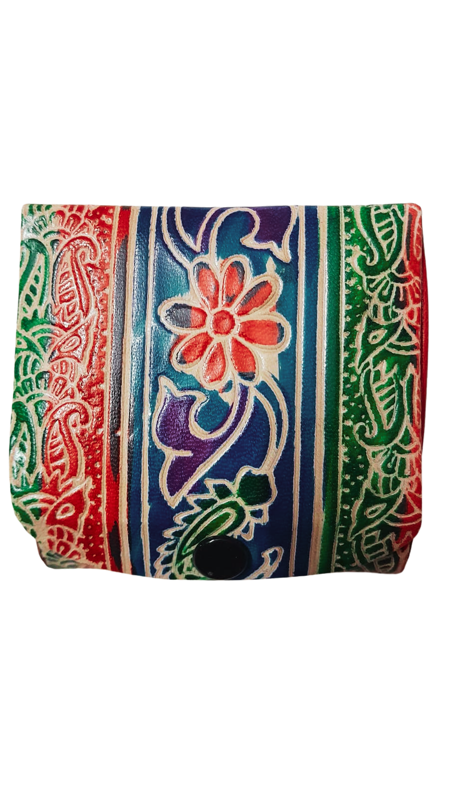 This case is made from handpicked, high-quality leather, known for its durability and soft texture. It’s then brought to life with delicate hand-painted motifs inspired by India’s cultural designs, making each piece beautifully distinct. The compact mirror inside adds a practical touch for on-the-go elegance, making it a fusion of convenience and charm.