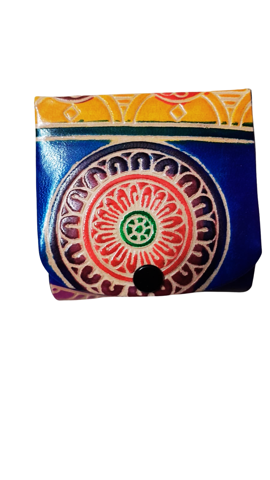 This case is made from handpicked, high-quality leather, known for its durability and soft texture. It’s then brought to life with delicate hand-painted motifs inspired by India’s cultural designs, making each piece beautifully distinct. The compact mirror inside adds a practical touch for on-the-go elegance, making it a fusion of convenience and charm.