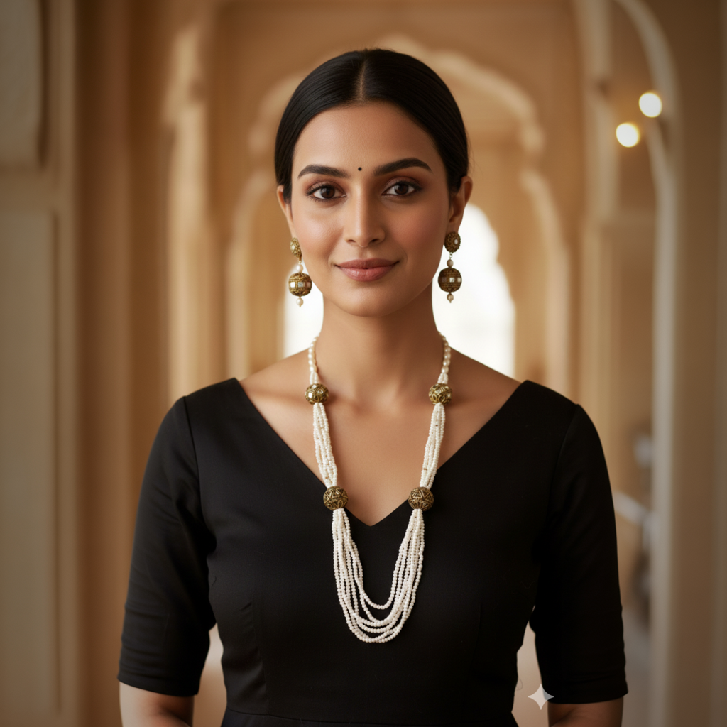 What makes this piece special is its ability to blend simplicity with ornamentation. The layered strands create fullness, while the neutral white tone keeps it versatile. It complements sarees, lehengas, kurtis, and even Indo-western outfits, making it suitable for both everyday elegance and special moments.