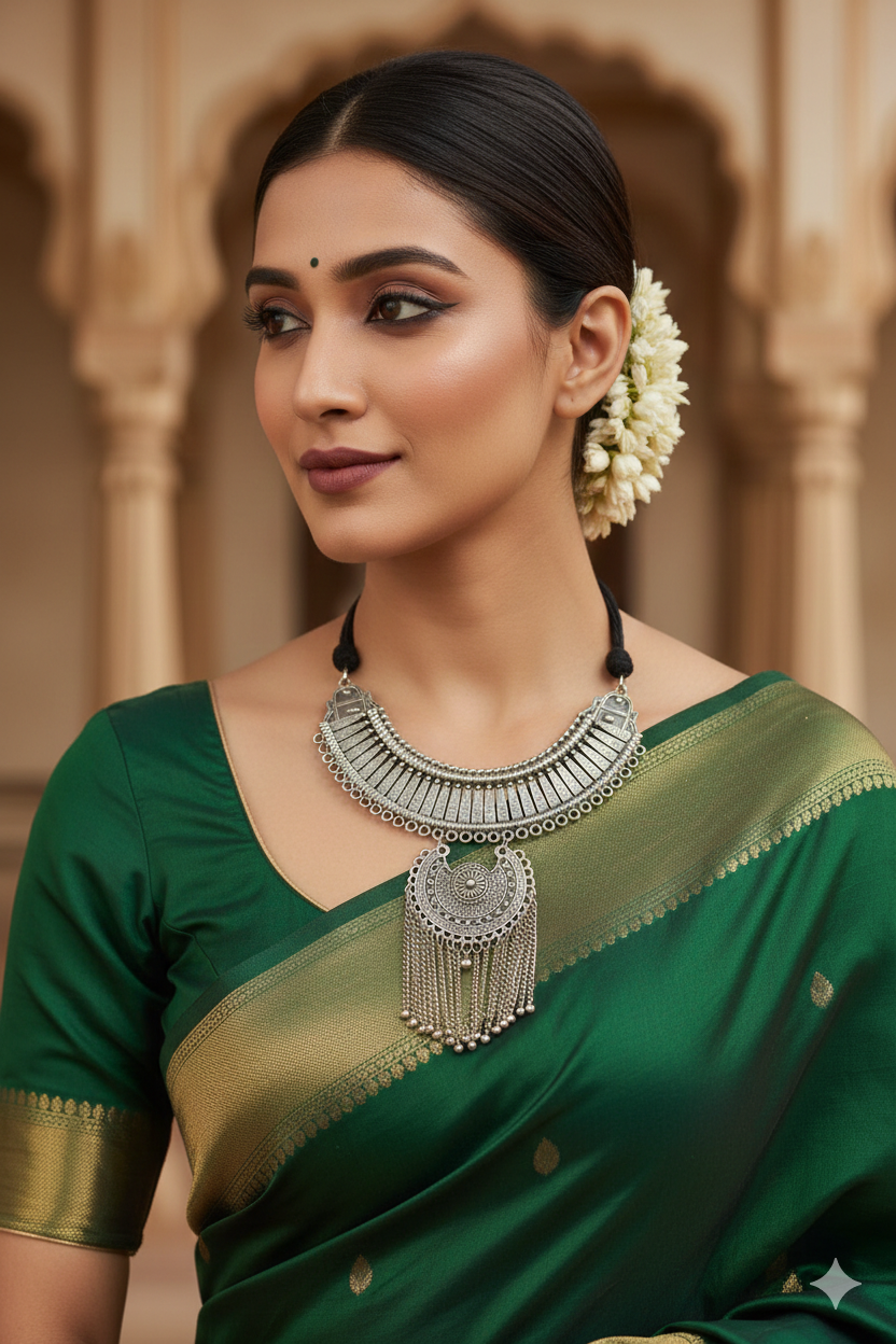 Give your ethnic wardrobe a sophisticated upgrade with this stunning Oxidized Silver Necklace. This piece is a perfect fusion of the traditional "Hasli" design and a modern "Boho" aesthetic. Its antique silver finish lends a vintage, royal charm that beautifully complements every skin tone and outfit.