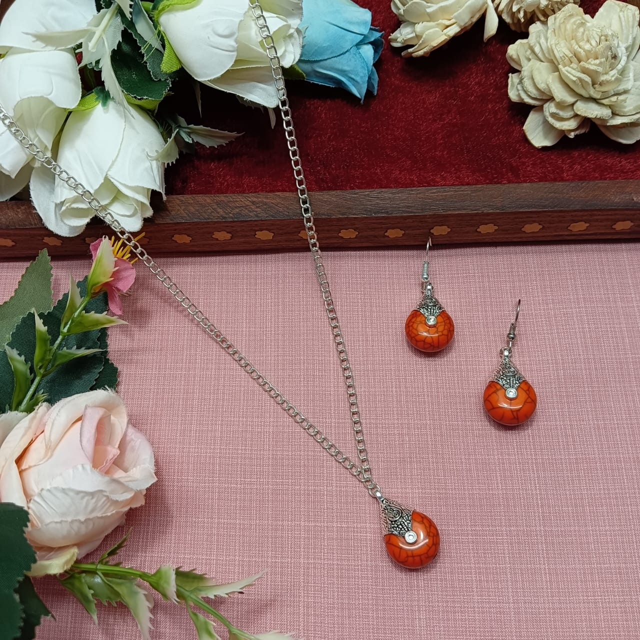 Elevate your elegance with this stunning Silver-Toned Pendant Necklace and Earring Set, featuring vibrant color simulated gemstones. The pendant showcases a lustrous stone set in a sleek silver-toned frame, suspended from a delicate chain for timeless appeal. Complementing the necklace, the matching drop earrings mirror the design with coordinating gemstones and fine detailing, creating a balanced and sophisticated look. Whether styled for festive occasions or to add a pop of color to your everyday wear, this jewelry set radiates charm, warmth, and refined beauty.