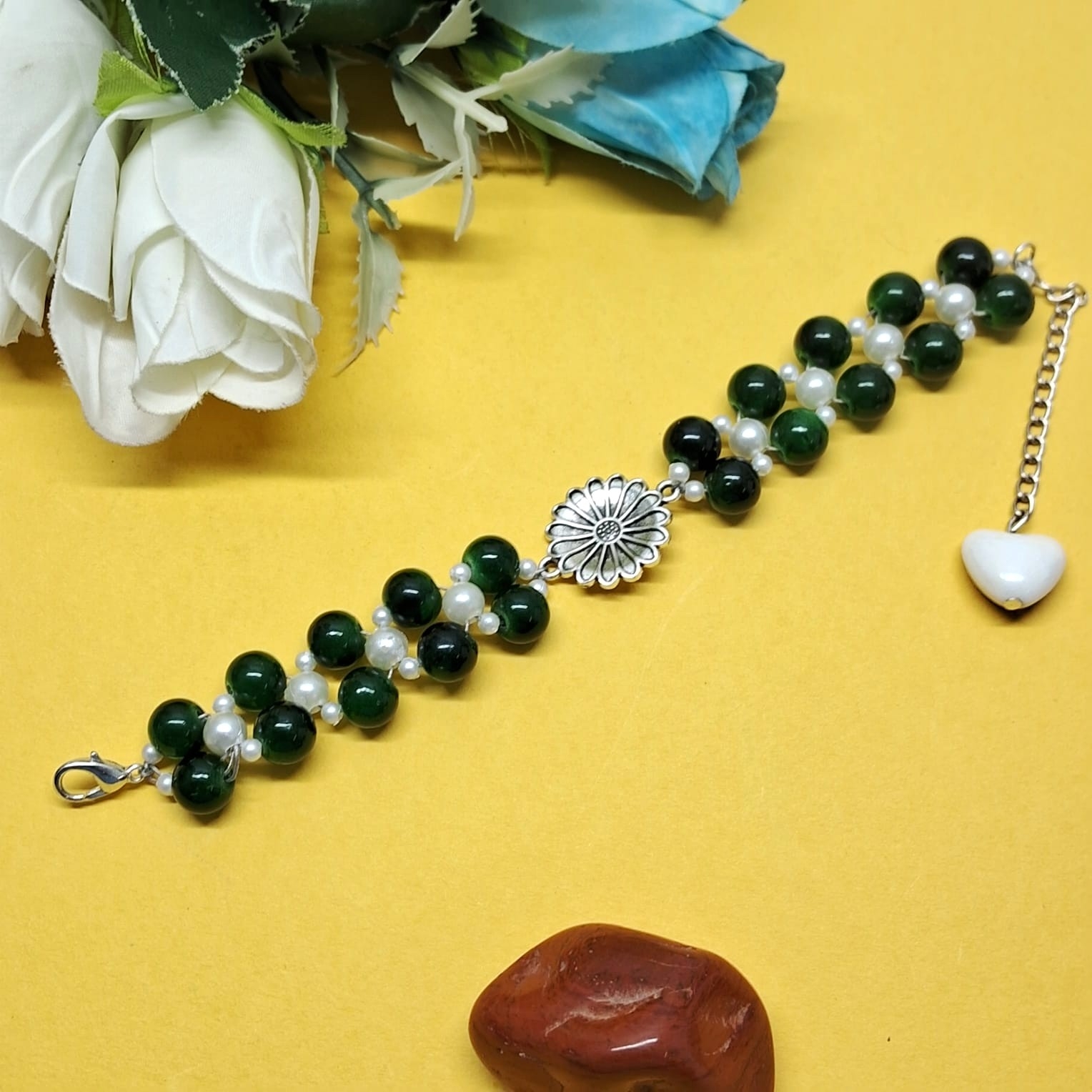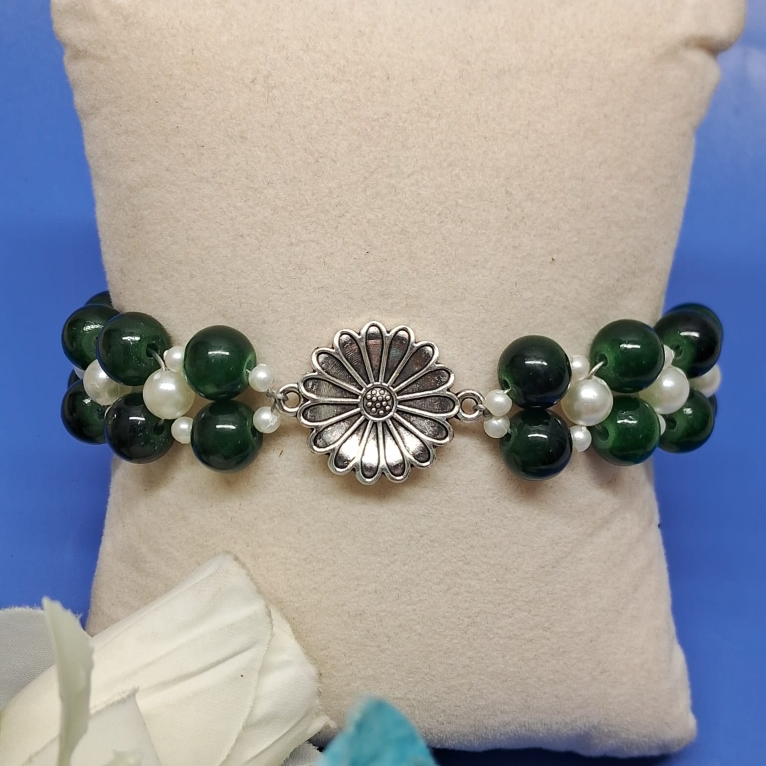 Elevate your collection with this exquisite handcrafted piece: two concentric rows of spherical beads encircle a multi-tiered floral centerpiece crafted from silver-toned metal. Designed with versatility in mind, it features secure lobster clasp at the top. Made from quality glass beads and a finely detailed metal floral charm, this piece blends artisanal elegance, cultural reverence, and functional beauty. Ideal for personal adornment, ceremonial use, it makes a striking and meaningful accent. To preserve its radiance, avoid contact with water and gently clean with a soft, dry cloth.
