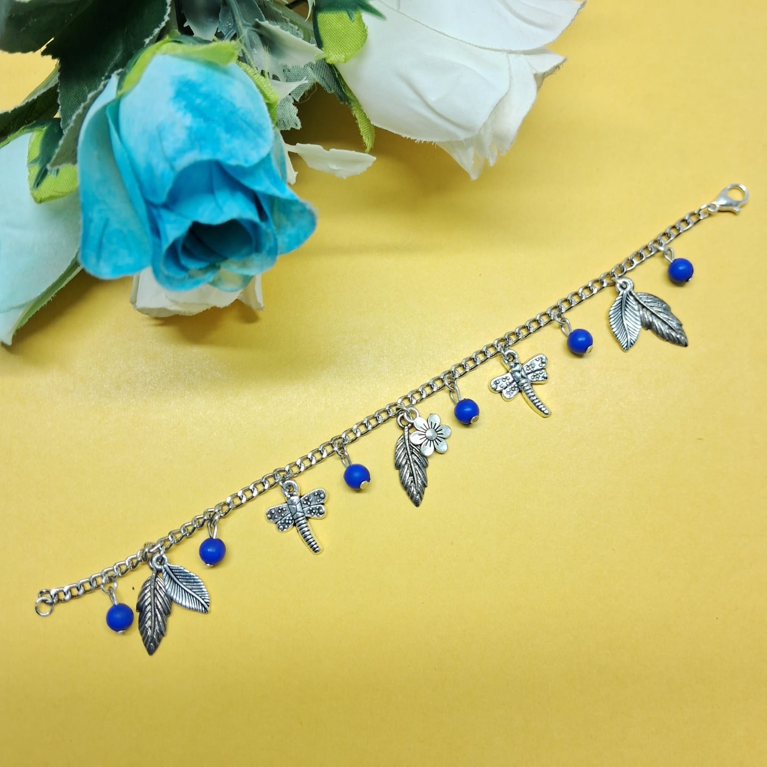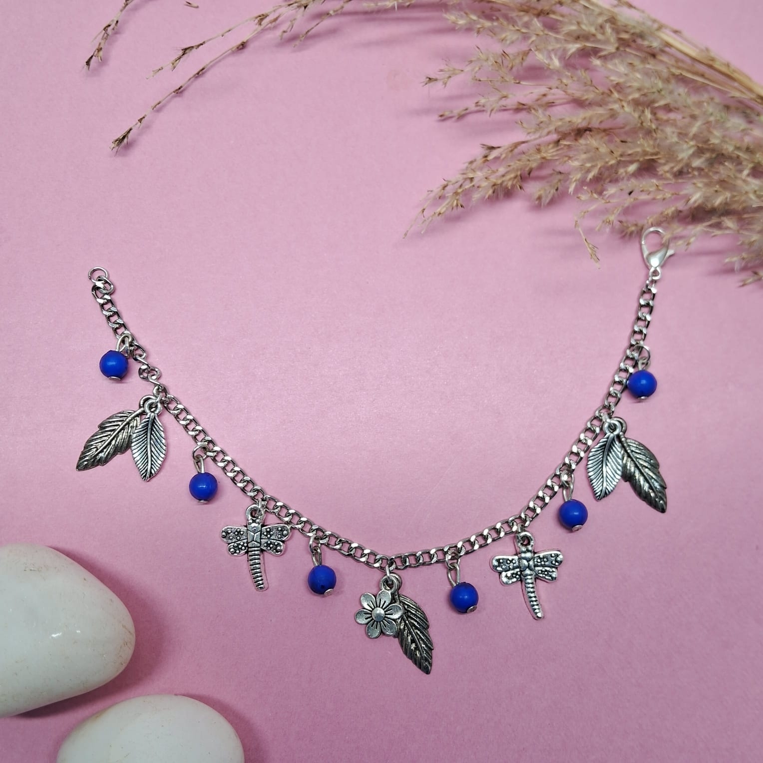 • Decorative Blue Accents – Blue enamel beads with dragonfly, leaf, and floral charms