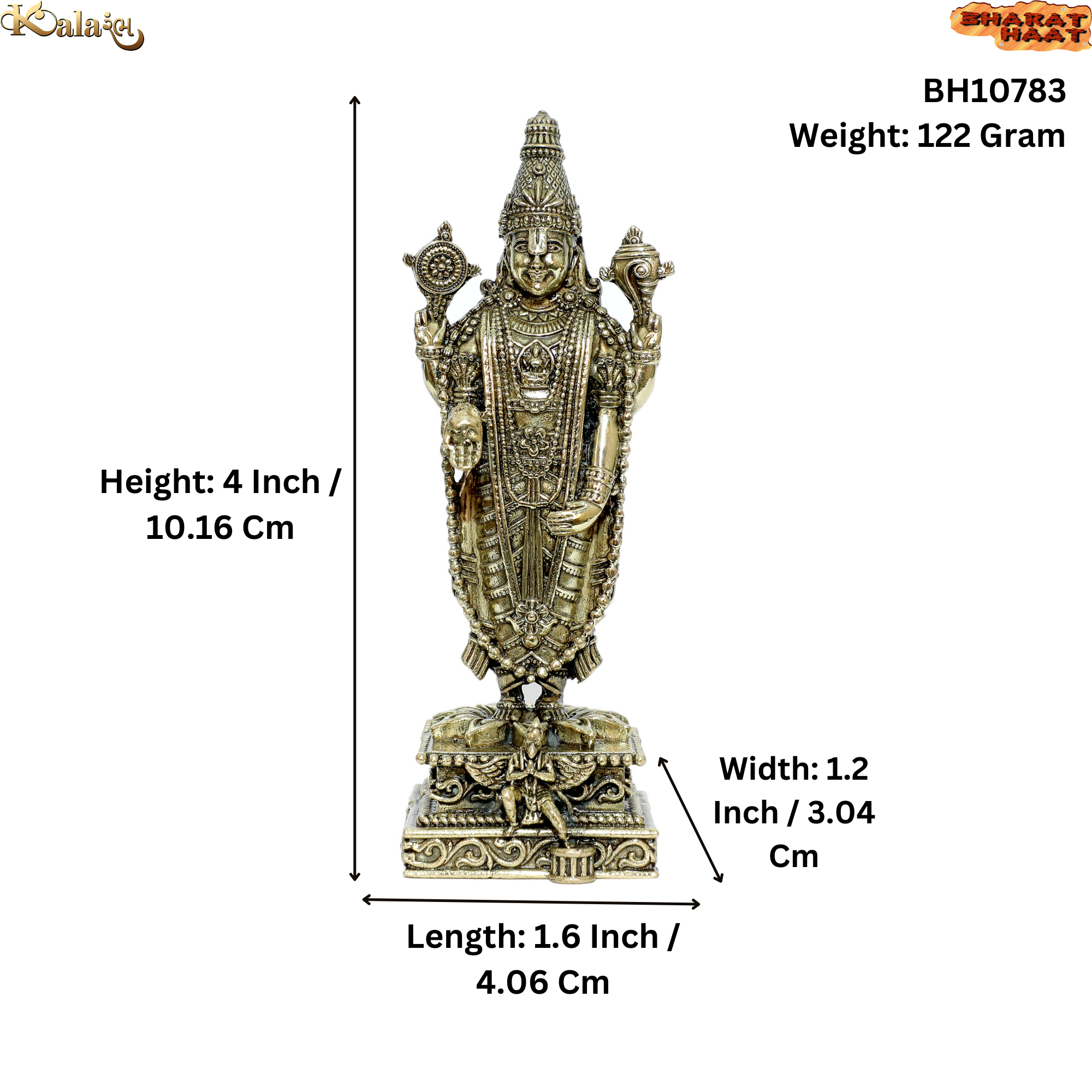 This idol is crafted from premium quality brass, ensuring durability and a timeless traditional appearance. The statue measures 1.6 x 1.2 x 4 inches (4.06 x 3.04 x 10.16 cm) and weighs 122 grams, making it ideal for home temples, pooja rooms, office desks, study tables, or meditation areas.