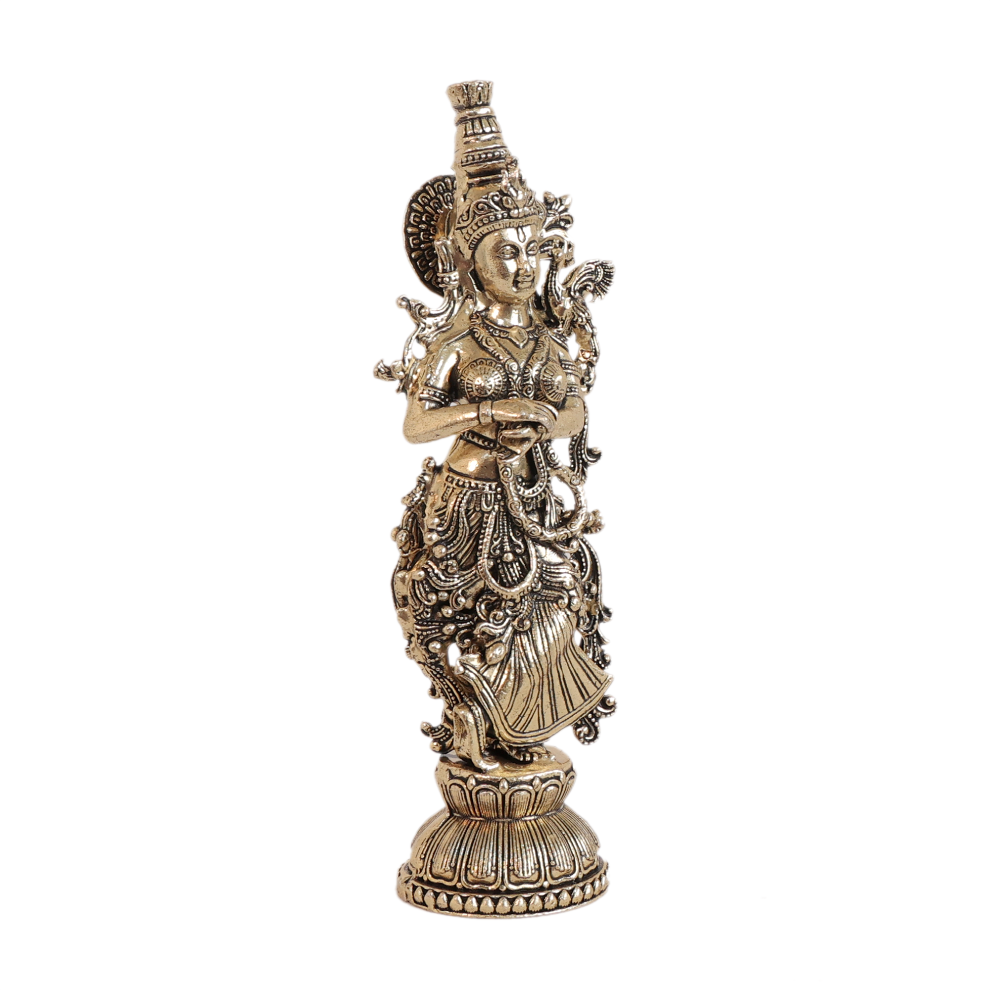 This Radha Brass Murti is crafted from high-quality solid brass, ensuring durability and a timeless traditional appearance. The idol features beautiful handcrafted detailing, highlighting the graceful posture and divine presence of Radha Rani.