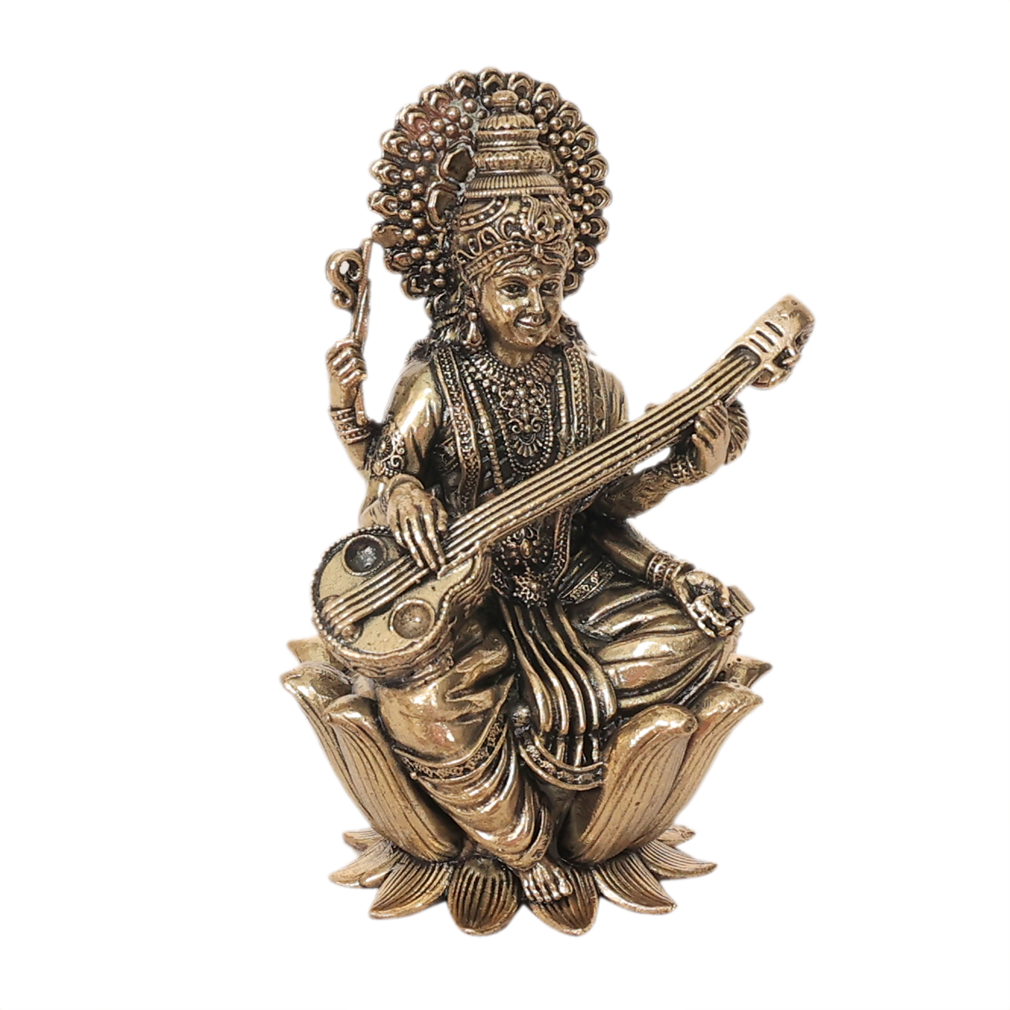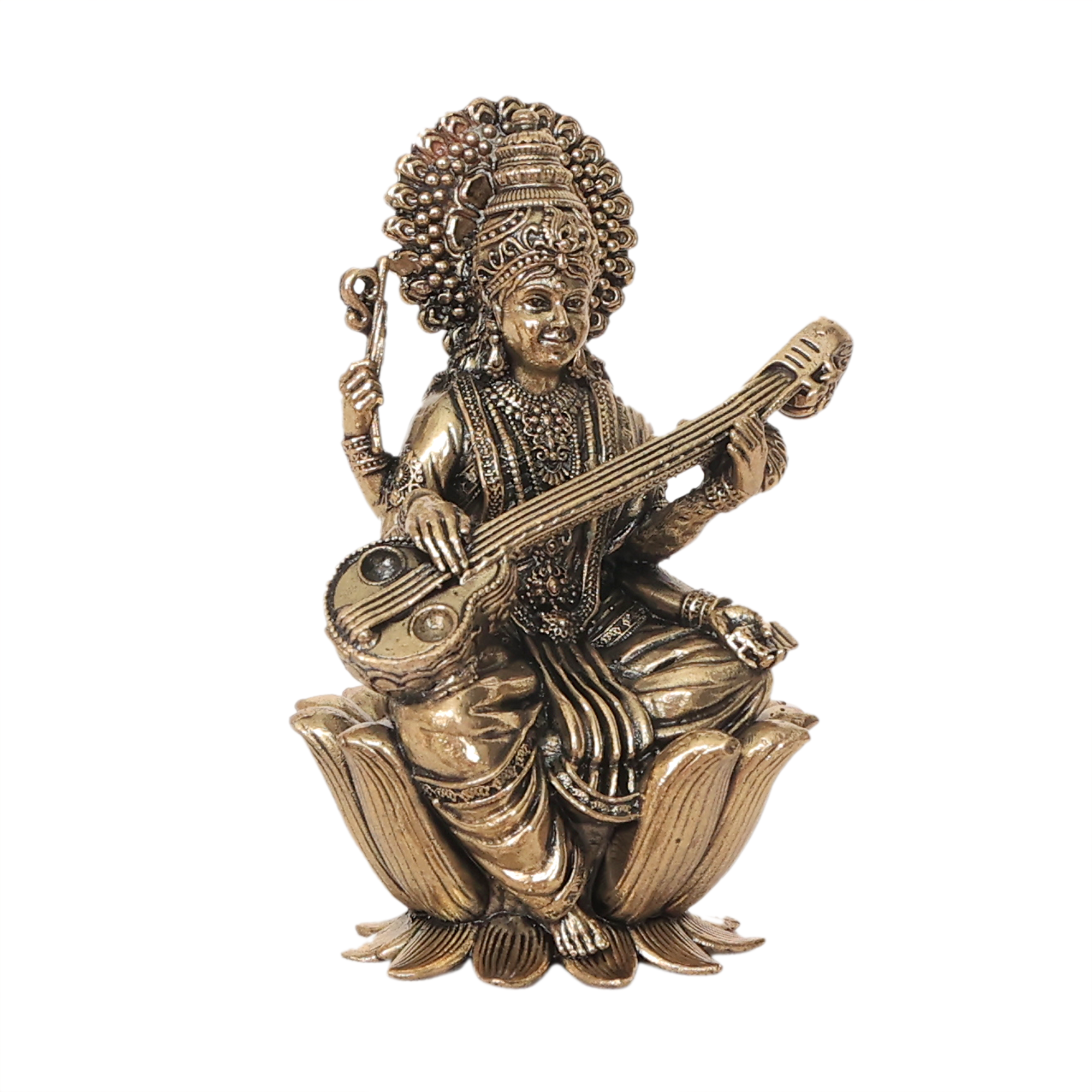 Bring divine blessings of wisdom and knowledge into your home with this Mini Brass Saraswati Idol. Crafted from premium quality brass, this small statue beautifully represents Goddess Saraswati, the Hindu goddess of knowledge, learning, music and arts.