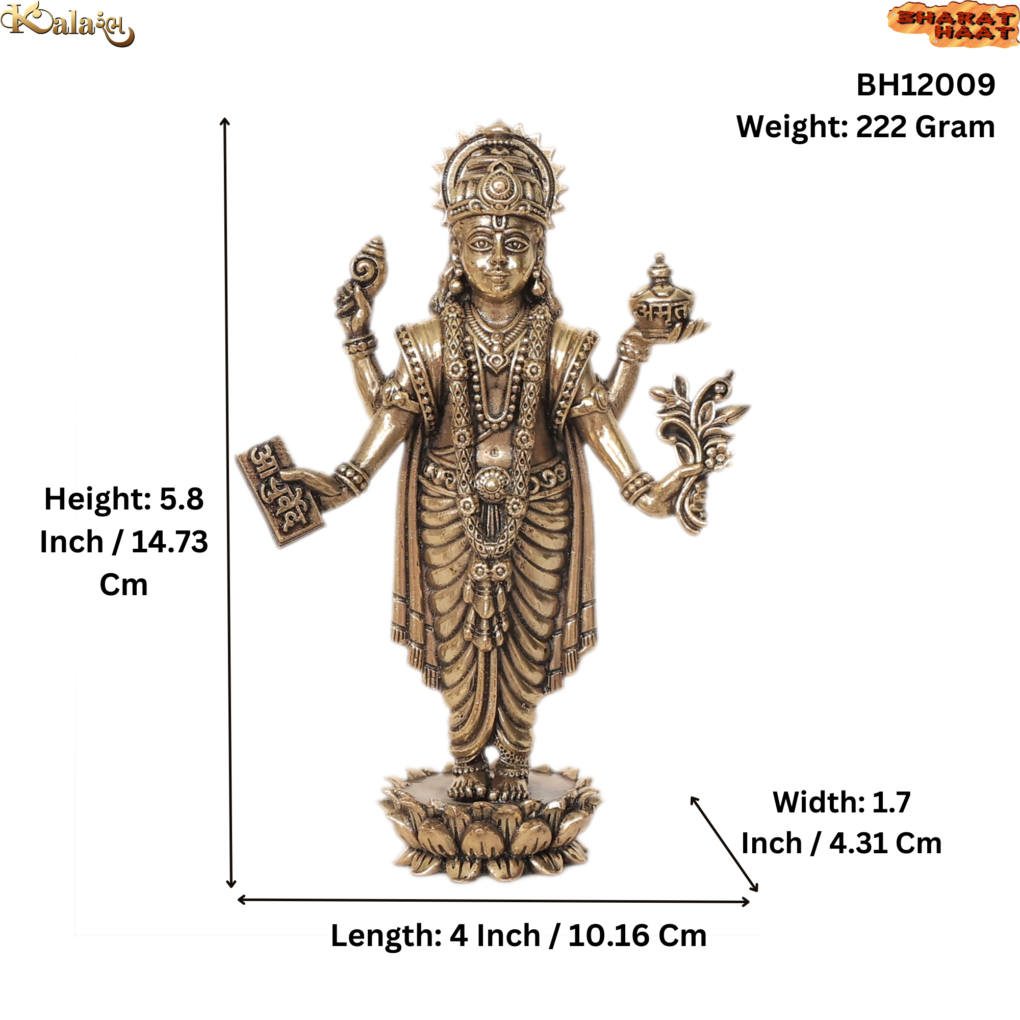 This elegant brass idol measures 4 x 1.7 x 5.8 inches (10.16 x 4.31 x 14.73 cm) and weighs 222 grams, making it a perfect decorative and spiritual piece for home mandirs, pooja rooms, Ayurvedic clinics, doctor offices and spiritual spaces.