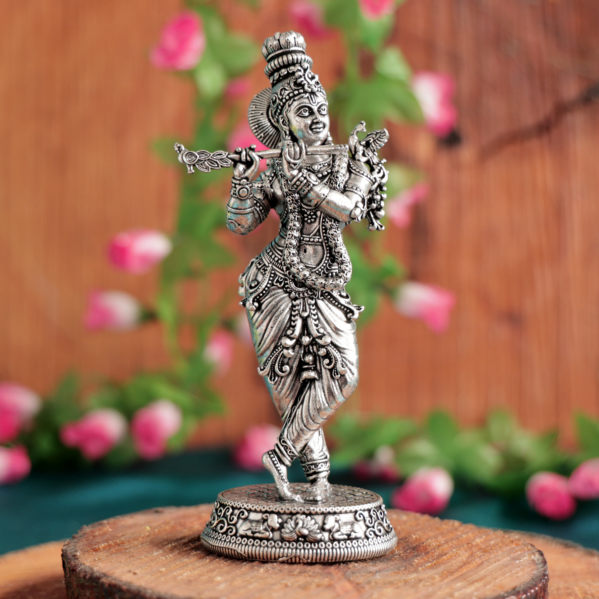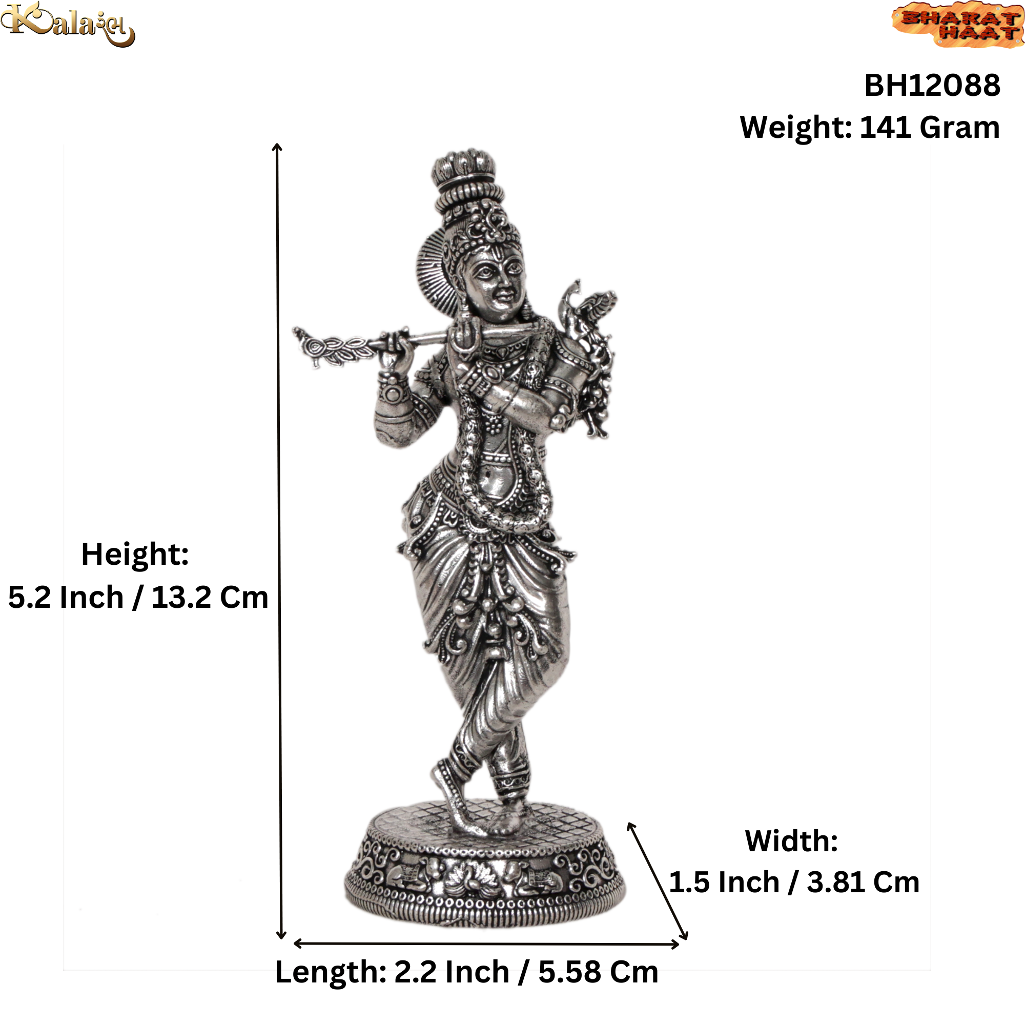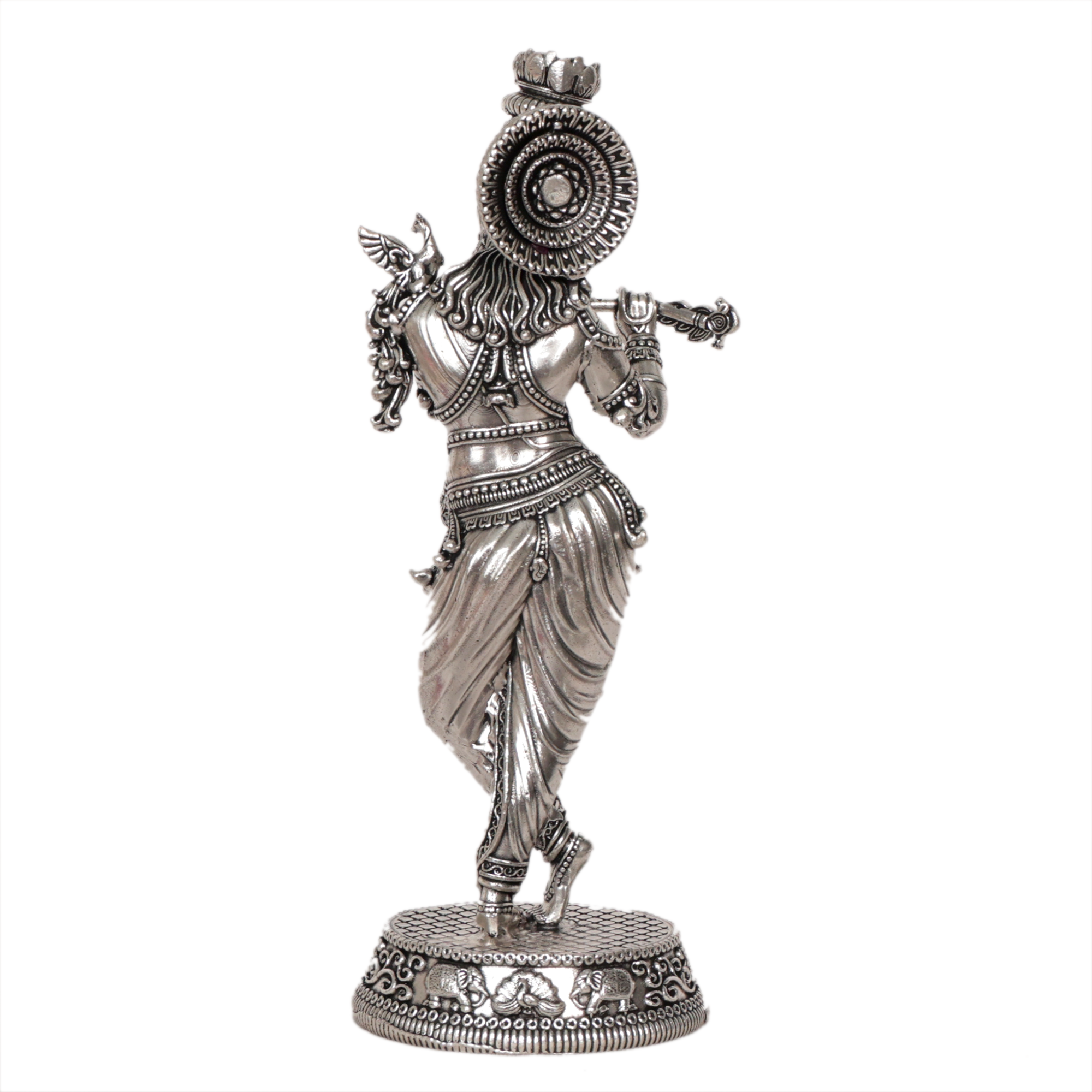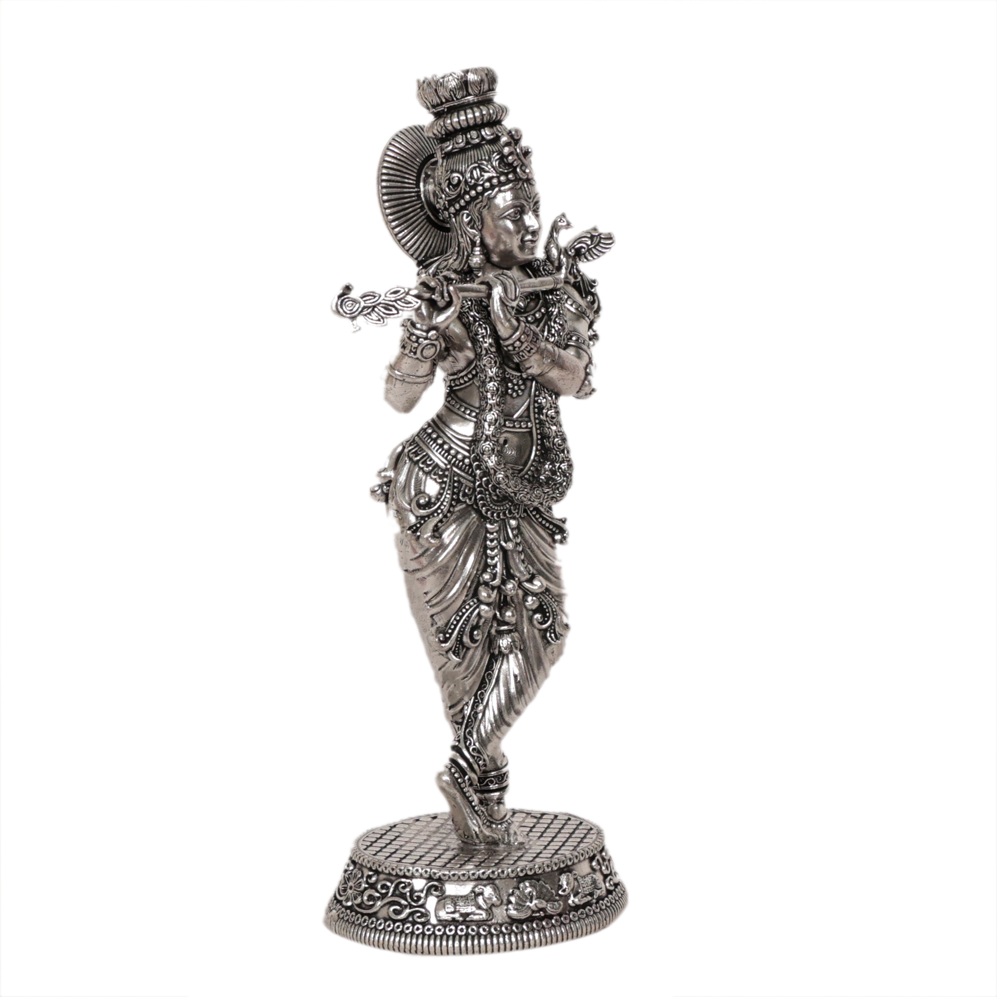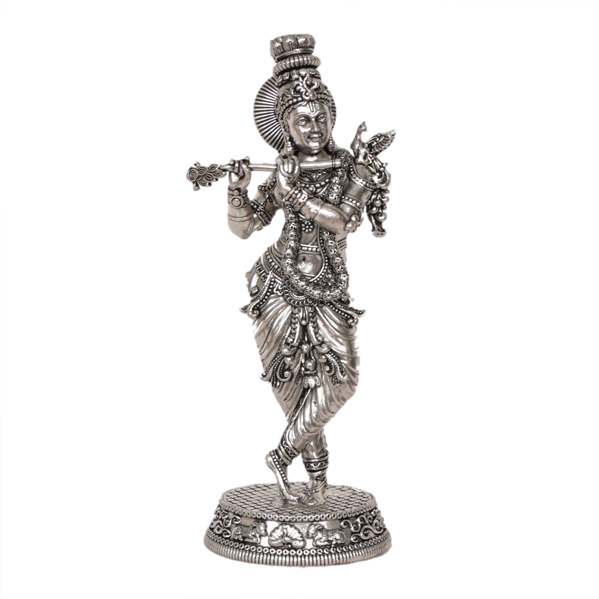 This Krishna murti features a premium silver finish, giving it a bright and attractive appearance that enhances the spiritual atmosphere of your home temple. The detailed craftsmanship reflects traditional Indian artistry and devotion.