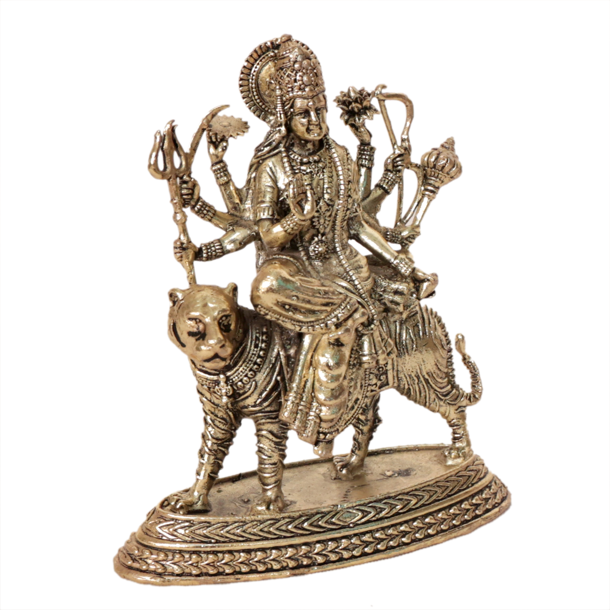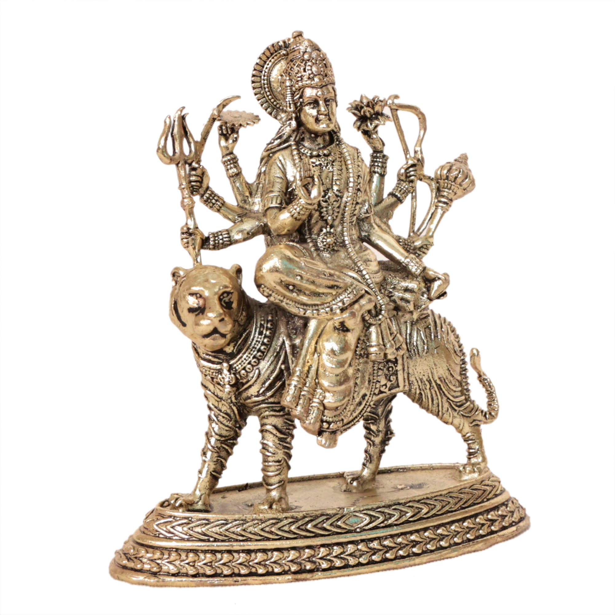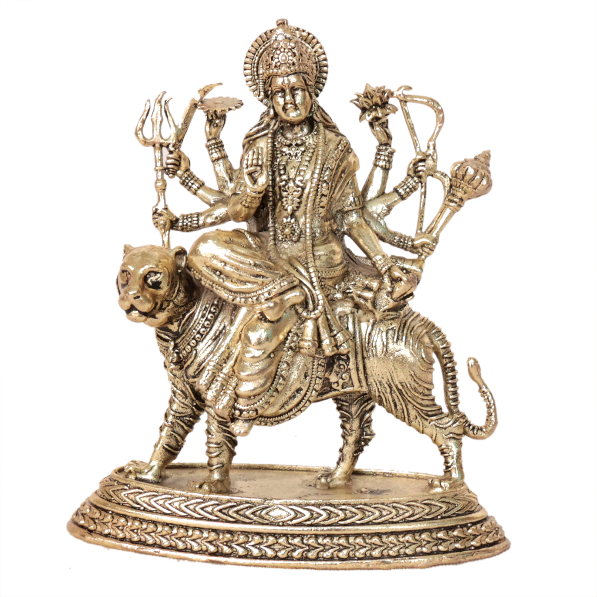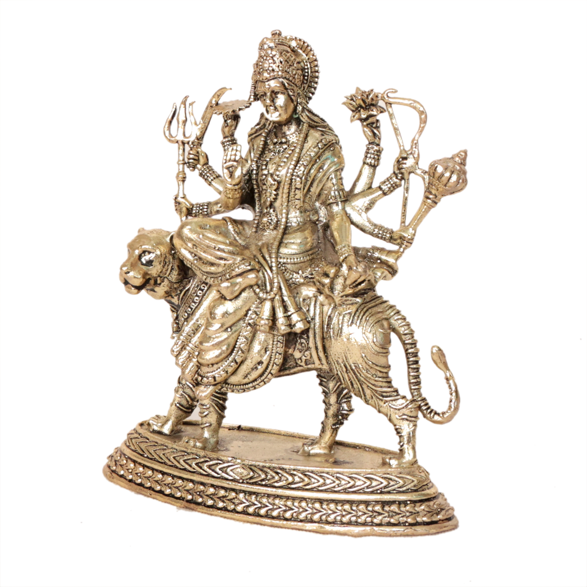 This elegant Ambe Maa murti is made from high quality solid brass and features detailed traditional craftsmanship inspired by Indian temple art. The natural golden brass finish gives the statue a classic devotional appearance, making it a perfect addition to your home temple or pooja room.