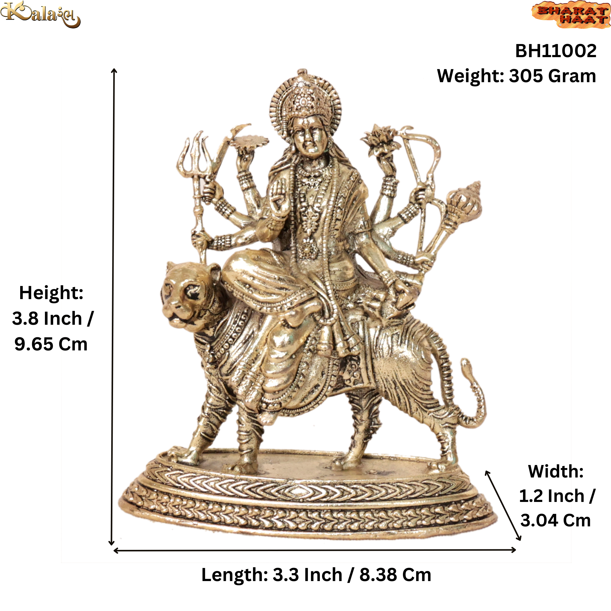 With a size of 3.3 x 1.2 x 3.8 inches, this brass Ambe Maa statue is ideal for placing in home temples, pooja rooms, office altars or decorative spiritual spaces. The compact yet prominent design allows it to fit perfectly in small mandir setups while still creating a strong divine presence.