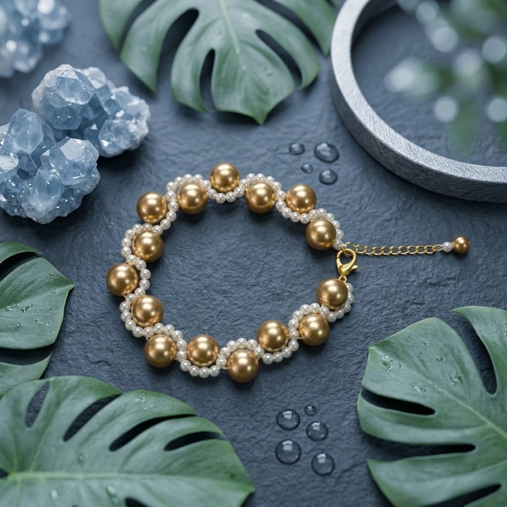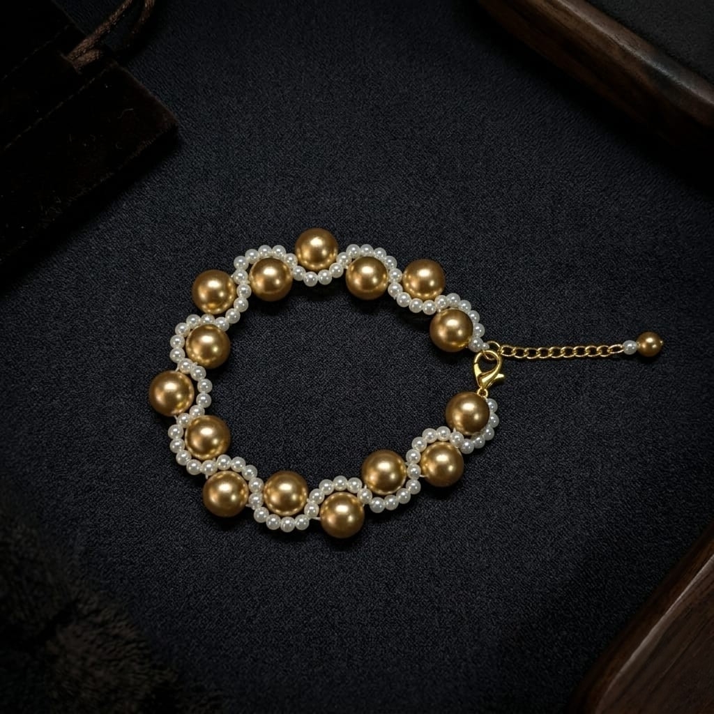 - Balanced gold-tone and white bead design