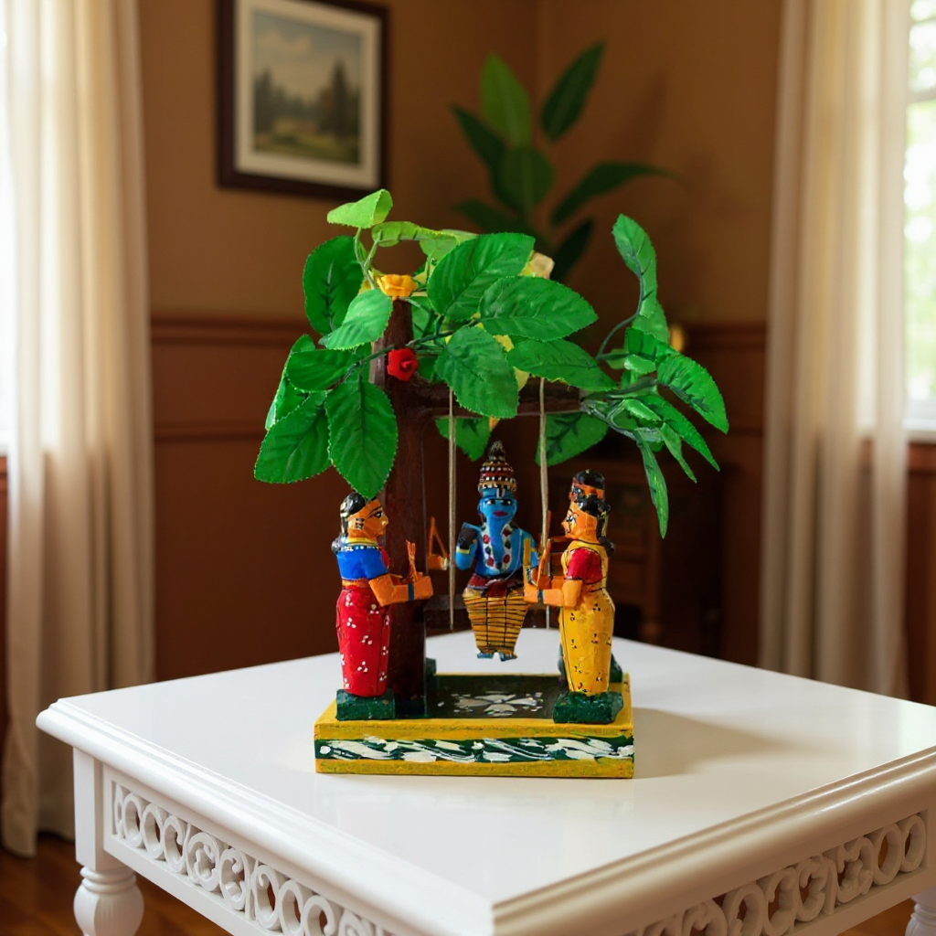 Lord Krishna and Gopikalu playing in the Brindavanam. Krishna & Gopikalu are made with wood knowen as Tellaponiki. Leafs are made with Plastic.