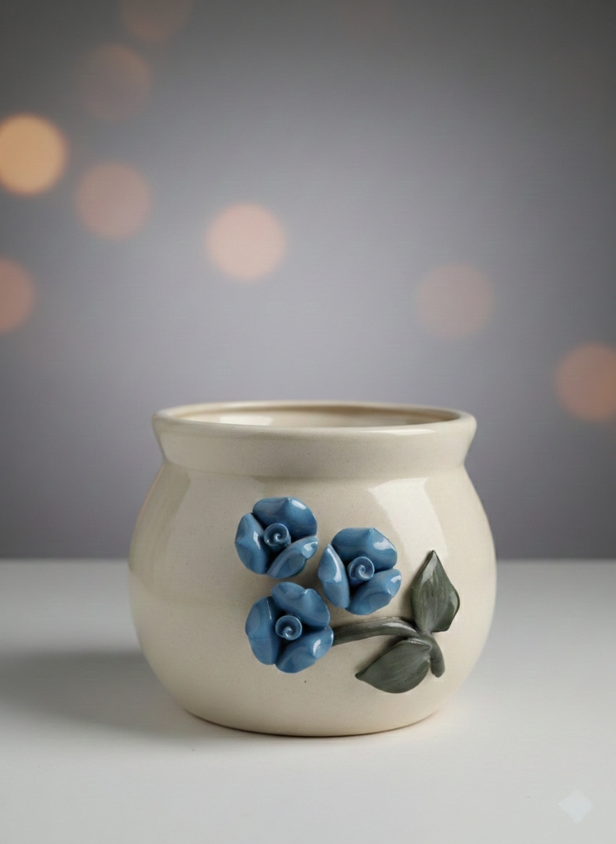 Bringing art to life with this beautiful ceramic pot adorned with delicate handcrafted floral detailing. Its soft tones and premium finish make it a timeless piece for any home décor setup.