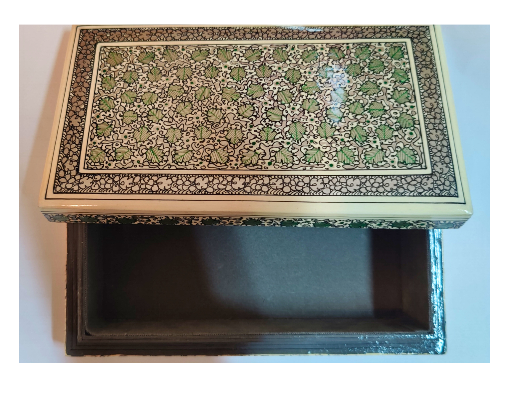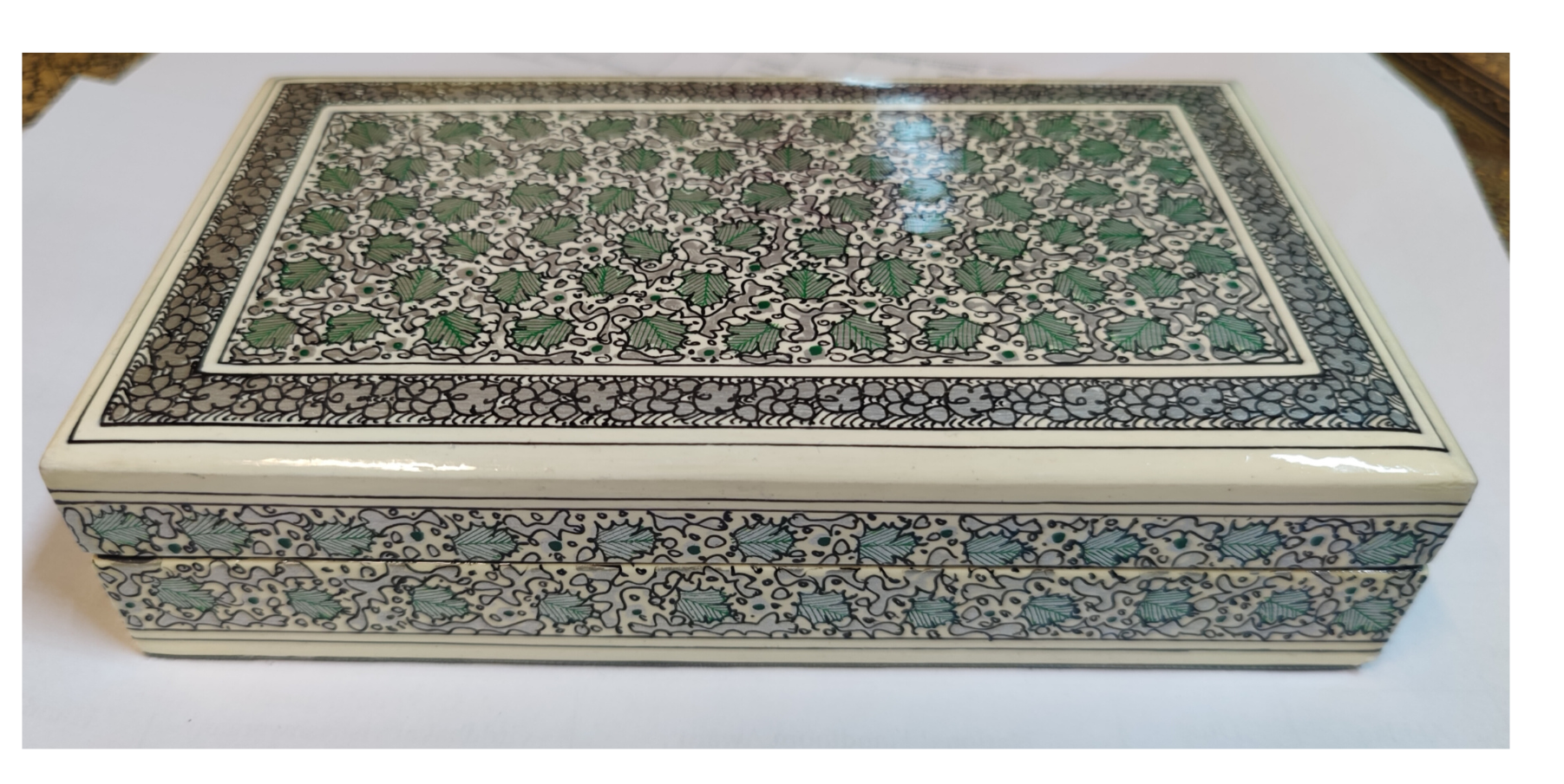 This handcrafted jewellery box features an elegant chinar motif inspired by traditional Kashmiri art. Made using skilled craftsmanship and detailed hand-painting, it offers both beauty and functionality. Ideal for storing rings, earrings, and small keepsakes, it adds a cultural and artistic touch to your dressing table or gifting collection.