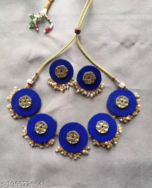 Blue fabric necklace set fully eco-friendly light weighted traditional ethnic jewellery . Fully eco-friendly light weighted jewellery . Fabric and artificial kundan and pearl is used.