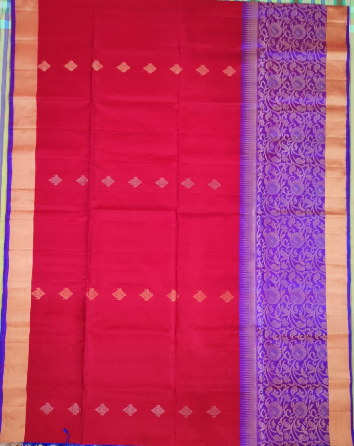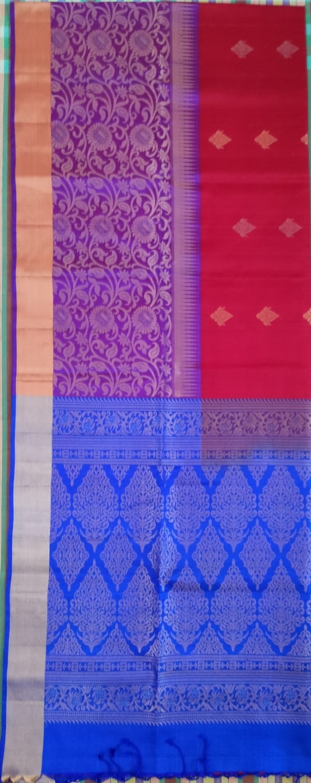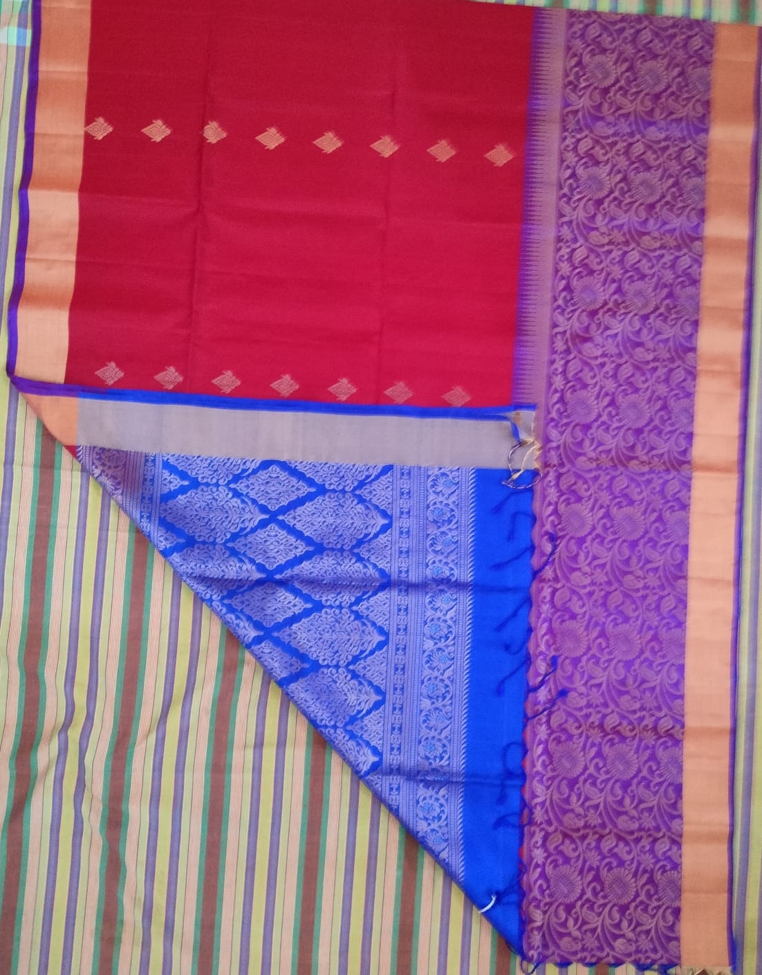 The Covai Silk Saree is also known as Soft Silk Sarees which are woven in Coimbatore district of Tamilnadu. In this Saree variety instead of gum, plain water is applied and rubbed thoroughly by the weaver to get the soft handle with improved luster on the saree. These Sarees are woven with large floral contemporary designs with fancy colors. As the name implies these Sarees are very soft handle and light weight which makes the wearer so comfortable.