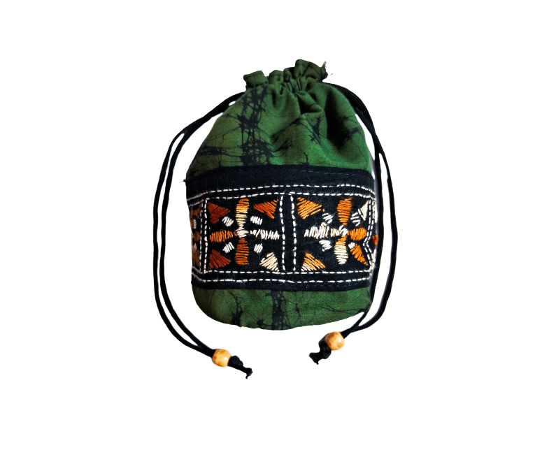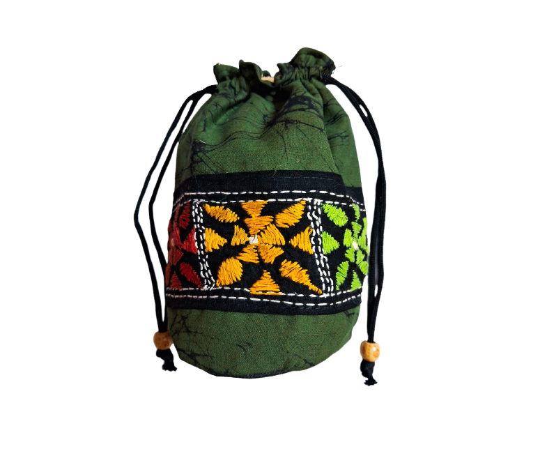 Pure Cotton Batik Kantha Stitch Work Potli Bag | Green