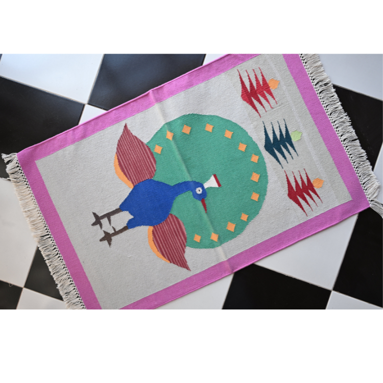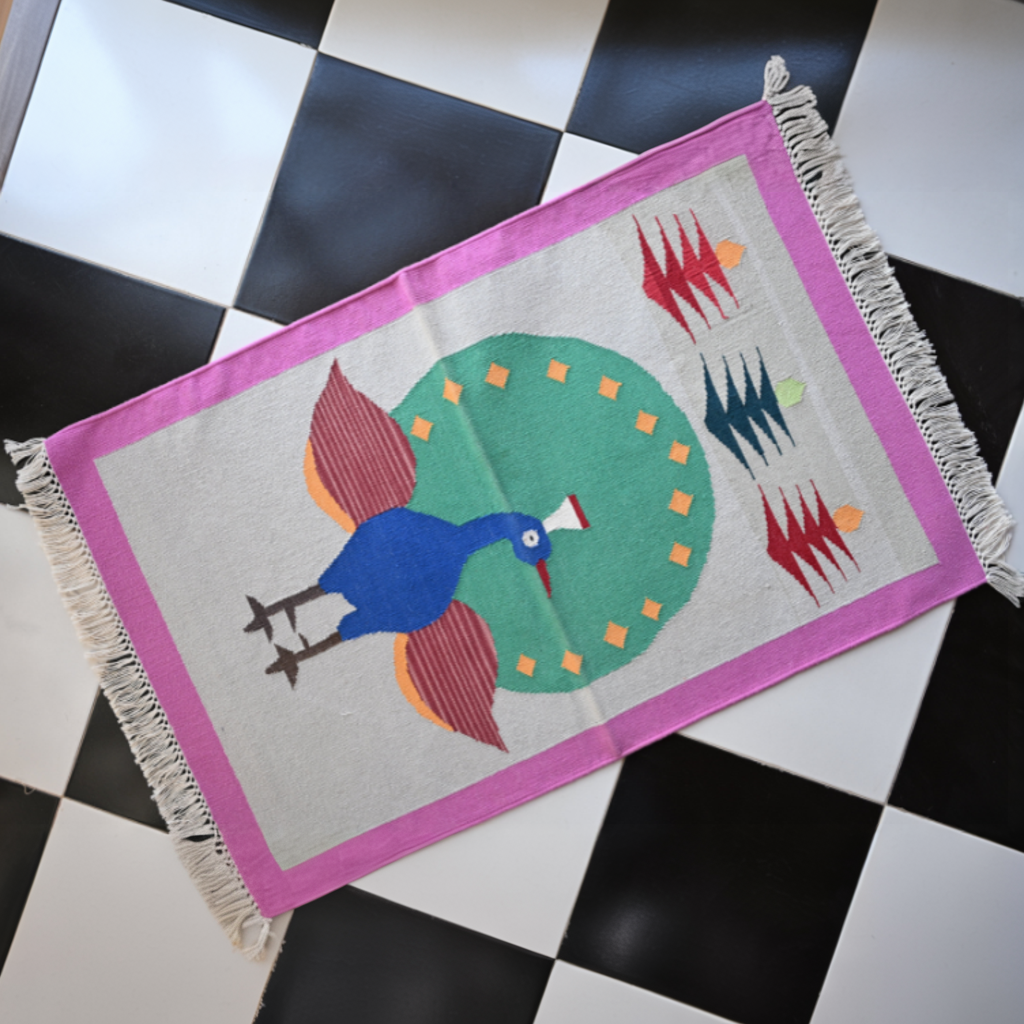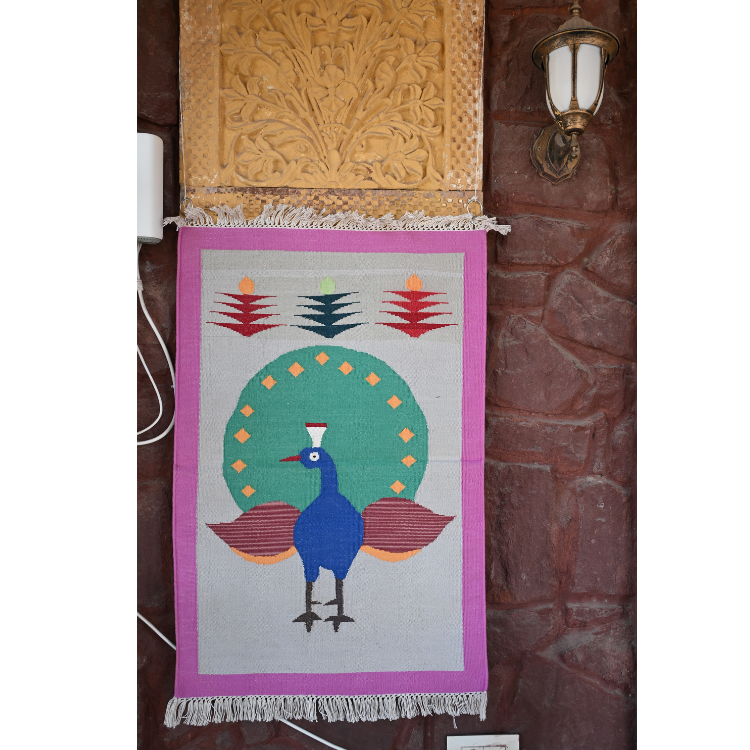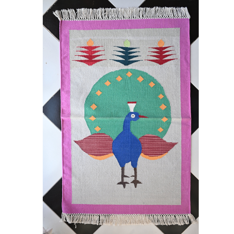 Discover our handwoven 2×3 ft Salawas Panja loom cotton dhurrie featuring a vibrant peacock motif in pink, beige, and red. This lightweight yet durable rug blends tradition and elegance, making it perfect as an accent floor covering, wall hanging, framed artwork, or table cover. Crafted by skilled Rajasthani artisans using a centuries-old Panja weaving technique, each eco-friendly piece offers unique, intricate patterns inspired by Indian wildlife and flora. Easy to maintain—vacuum regularly, spot-clean with a damp cloth, and dry-clean or hand-wash gently—this versatile decor adds warmth and cultural charm to living rooms, bedrooms, meditation spaces, or as a thoughtful gift. Bring home a timeless handcrafted masterpiece that celebrates heritage, sustainability, and artisanal craftsmanship.