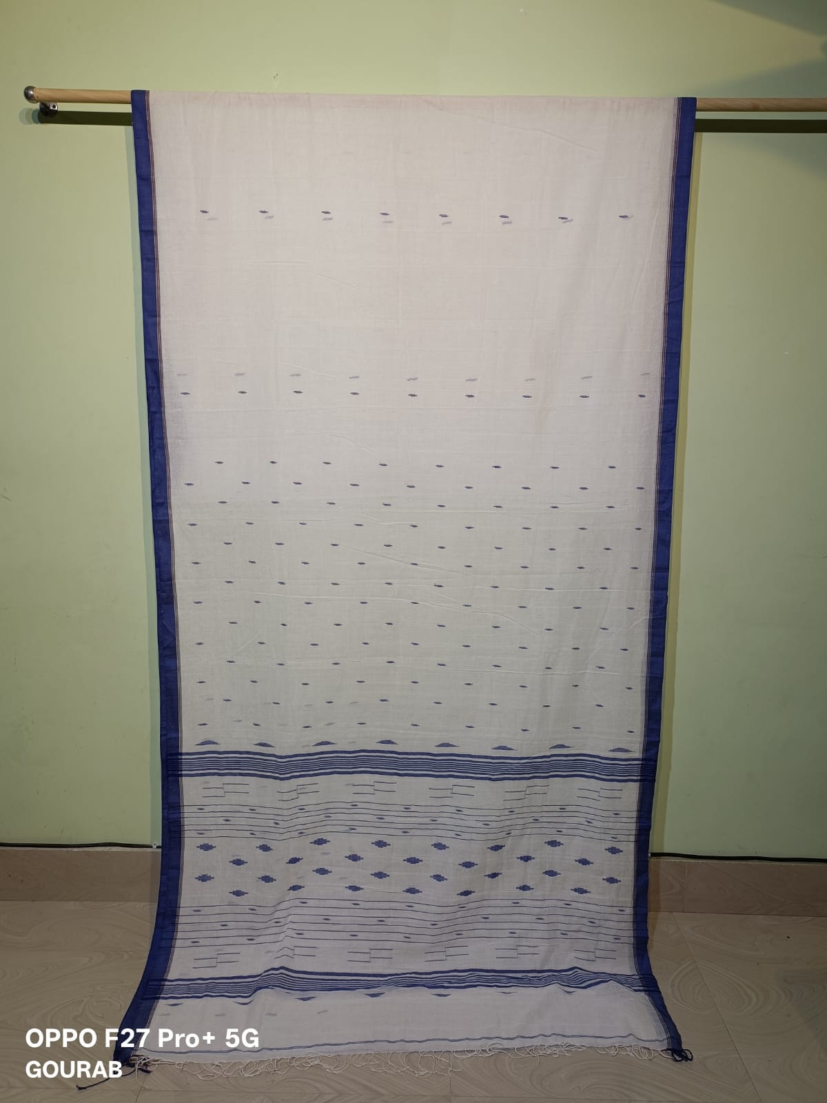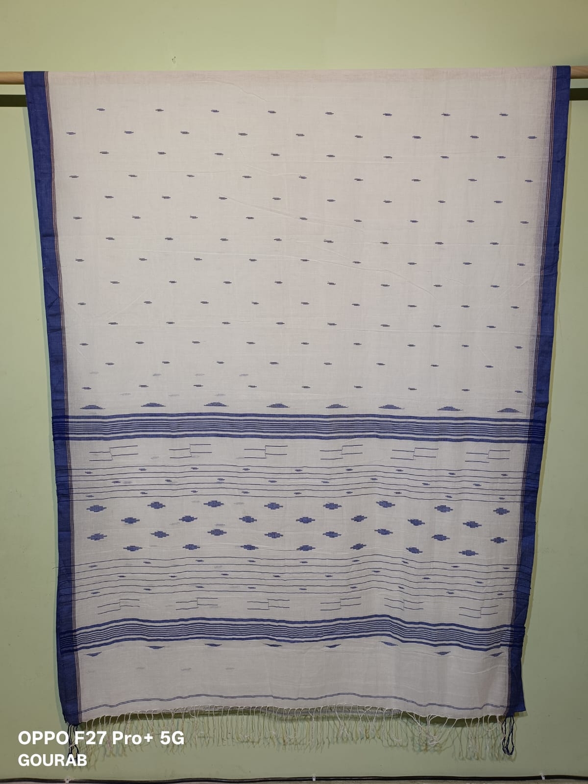 Fabric: 100% pure cotton colour: White base with blue motifs and border Design: Subtle woven patterns throughout with a traditional pallu design. Type:Handloom/Handmade.