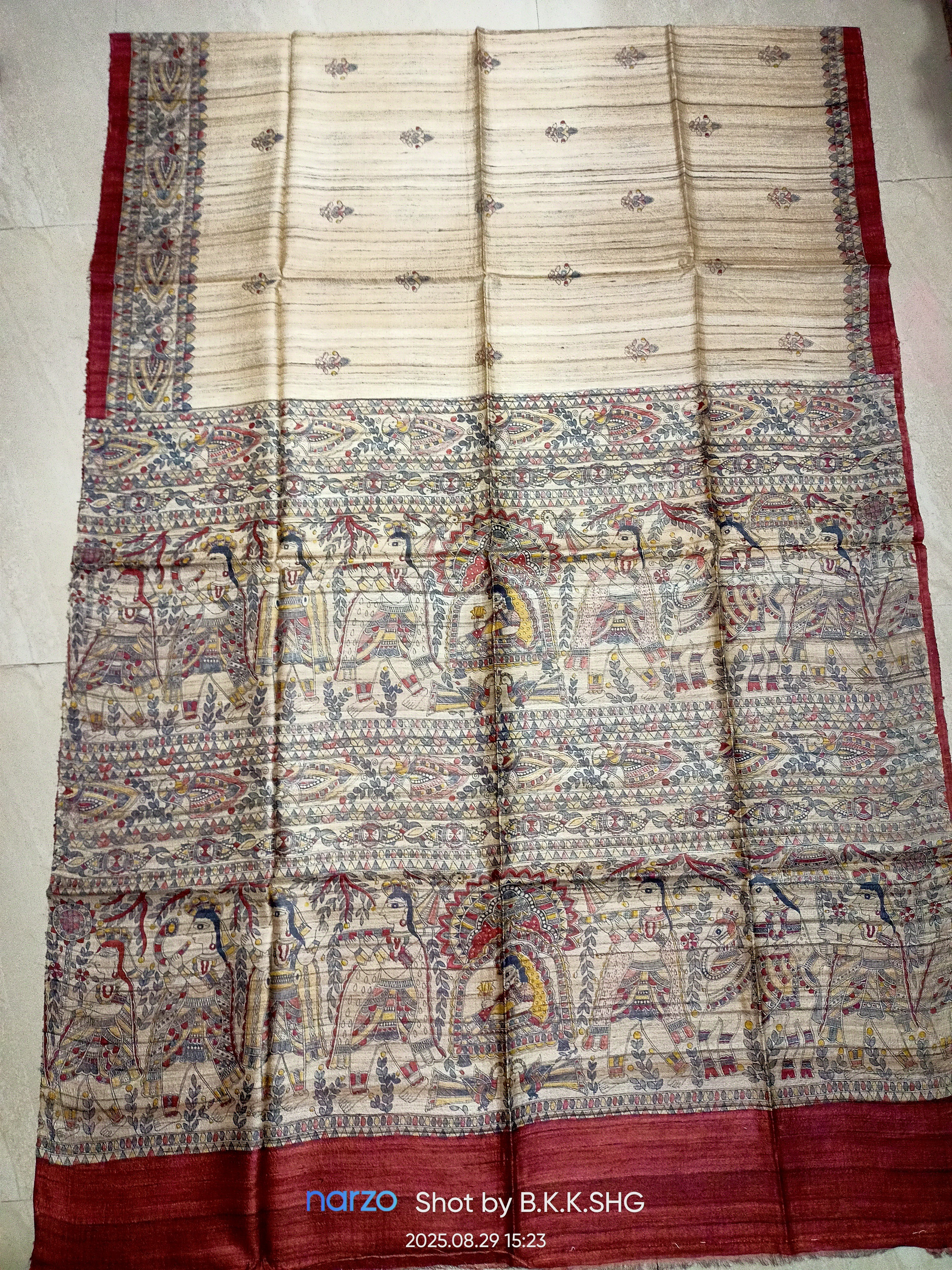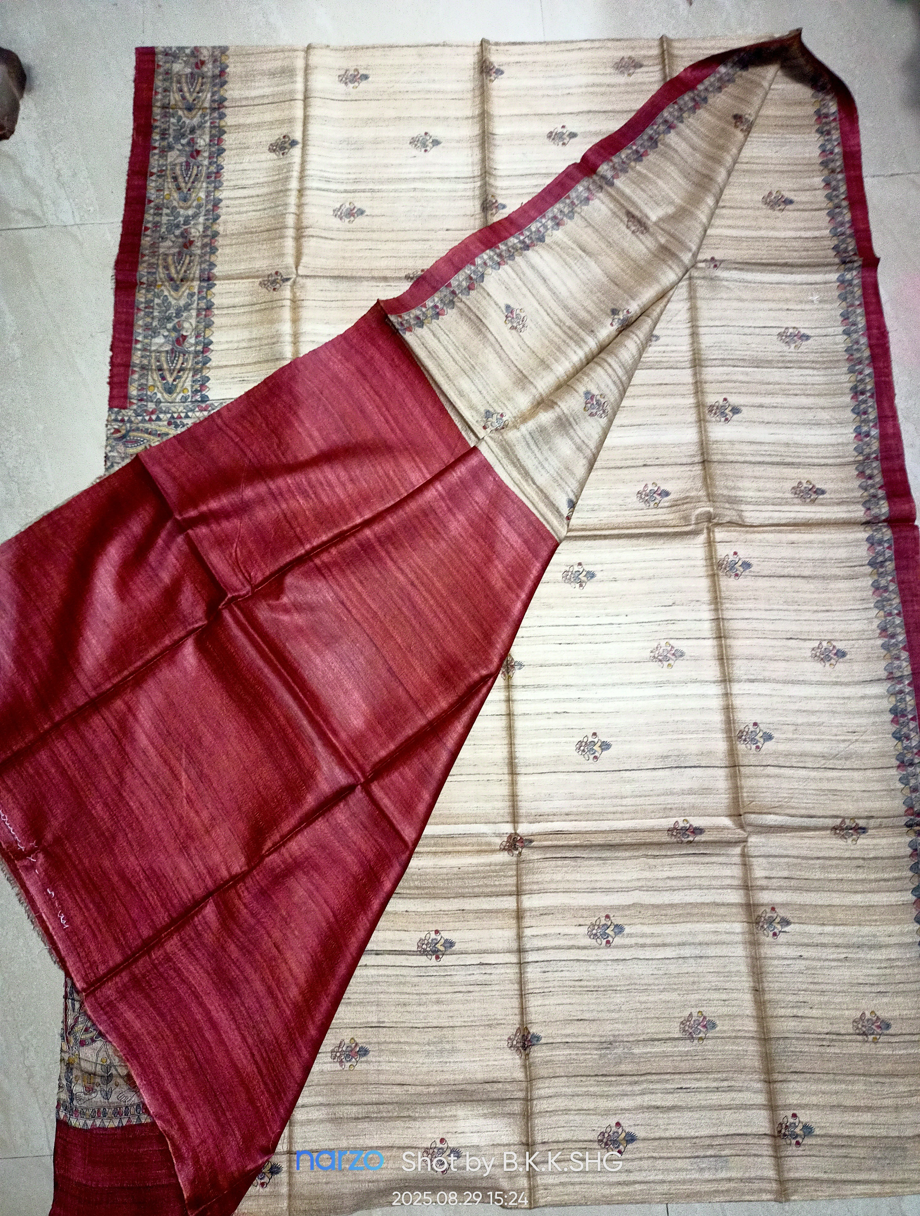 Tasar by ghicha silk saree ,width-45 inch,lenth-6.30 cm,warp- mulberry Tasar ,weft- ghicha Yarn , design - madhubani screen print multi colour Red base