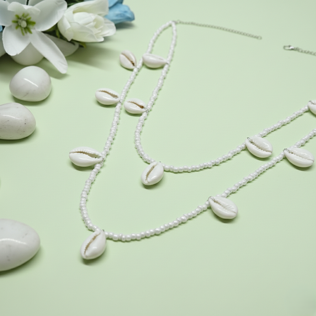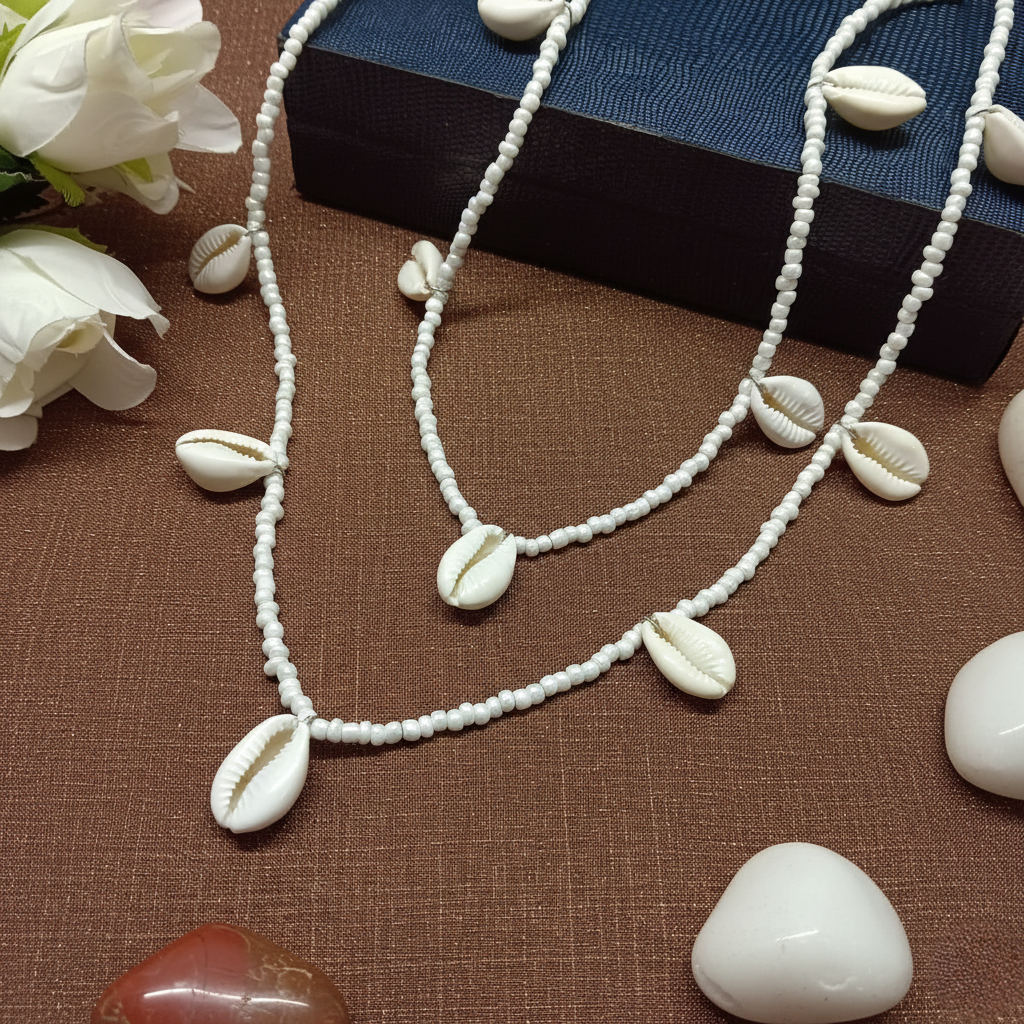 Bring a touch of the ocean’s charm to your style with this beautifully layered cowrie shell and bead necklace. Handcrafted with authentic, polished cowrie shells and delicate white beads, each strand is thoughtfully arranged to create a stunning layered silhouette. The natural cream tones of the shells blend harmoniously with the soft white beads, giving this piece an organic, breezy elegance.