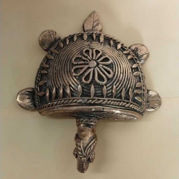 The D-Shape Turtle is a beautifully crafted piece of Dokra metalwork that captures both cultural heritage and modern design. Created using the ancient lost-wax casting method, this elegant figurine stands at 2" × 3.5" × 5". Its distinctive D-shape lends it a contemporary edge, making it a perfect addition to your home décor or a unique keepsake for gifting.