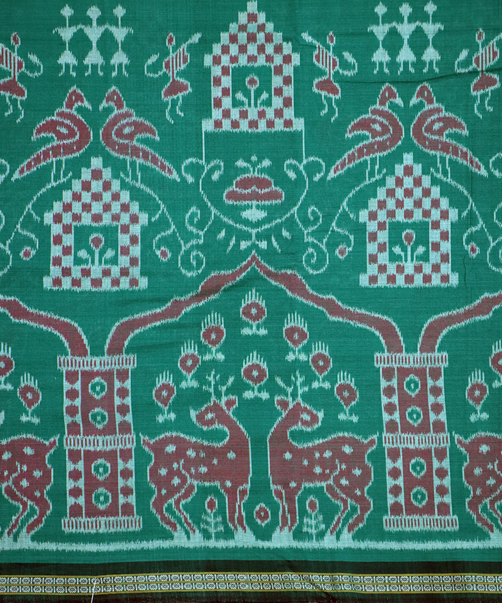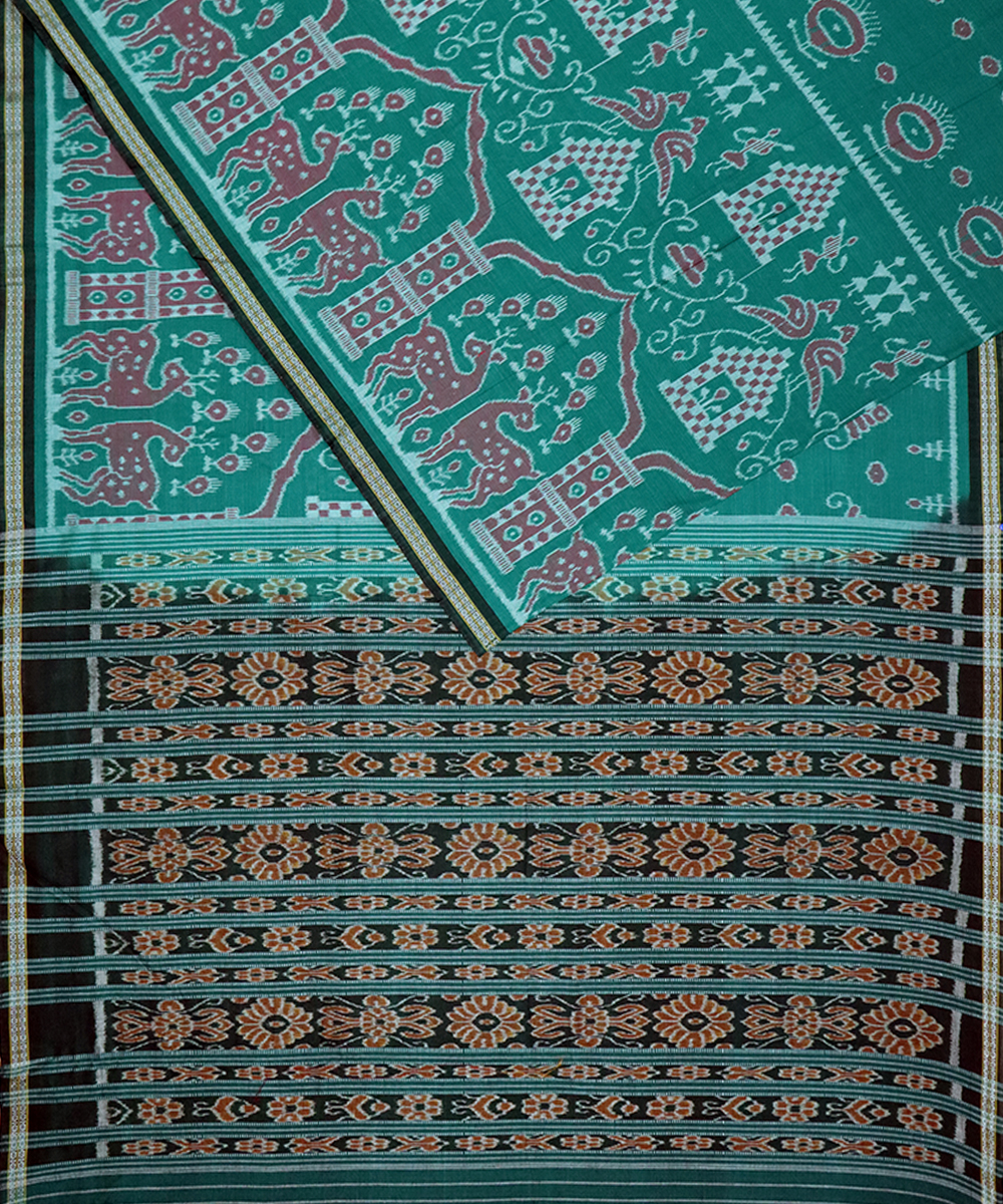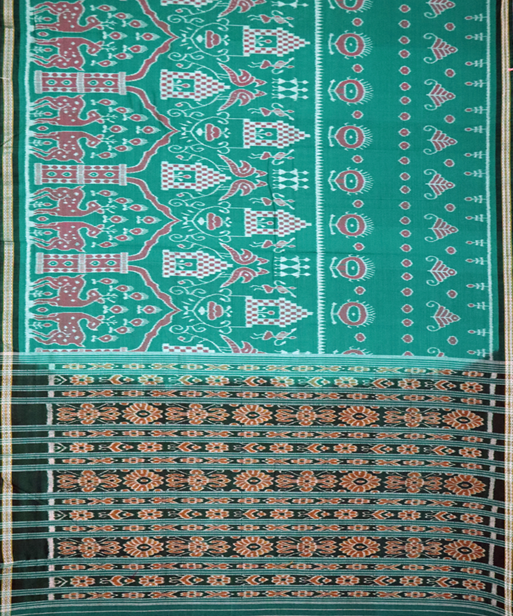 Exclusive Handwoven nuapatna cotton saree dark green base with Traditional ikat in body & border black base with dobby & Pallu black base with traditional ikat ,Saree has no Blouse piece.