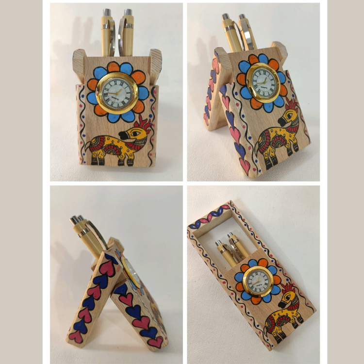Add charm to your workspace with this beautifully handpainted Deer Pen Stand featuring a built-in clock. Crafted from durable wood, it showcases vibrant folk art detailing that enhances its aesthetic appeal. The compact design neatly holds your pens, pencils, and stationery while keeping time at a glance.