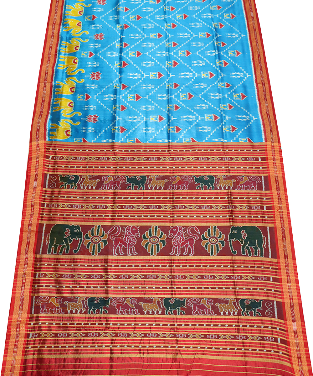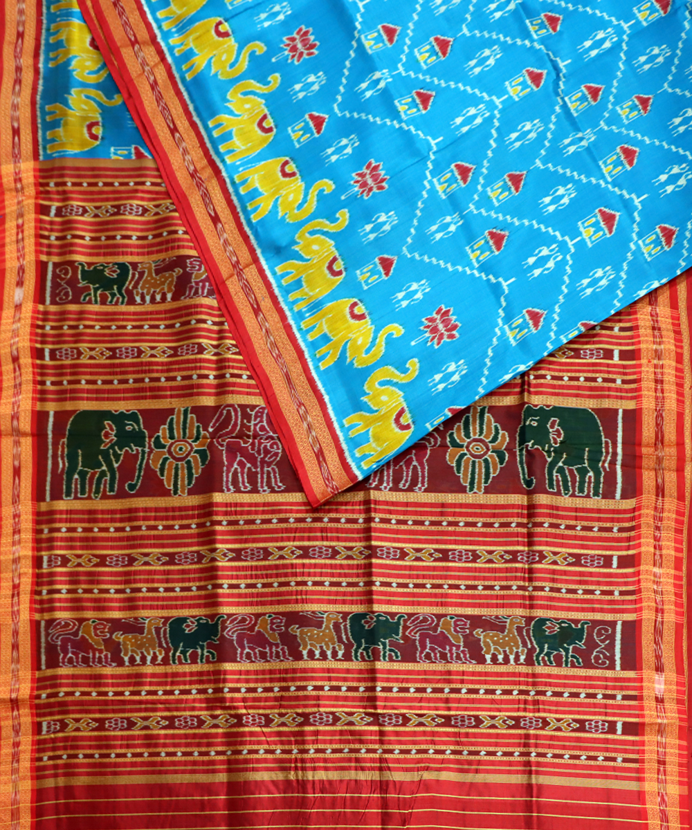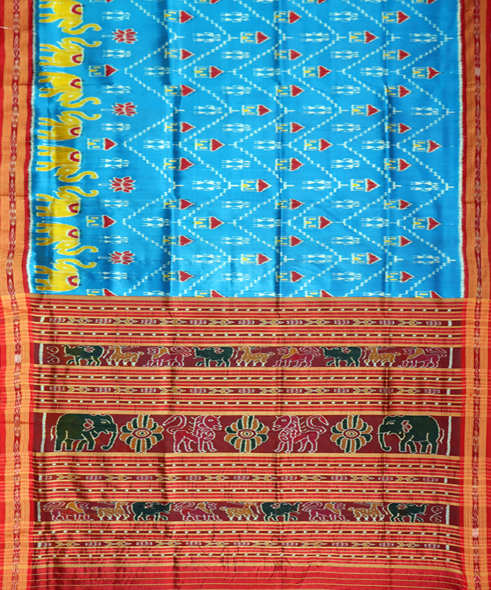 Handwoven traditional Khandua silk saree denim base Ikat in body & border dark red base with Traditional ikat & Pallu dark red base with traditional ikat