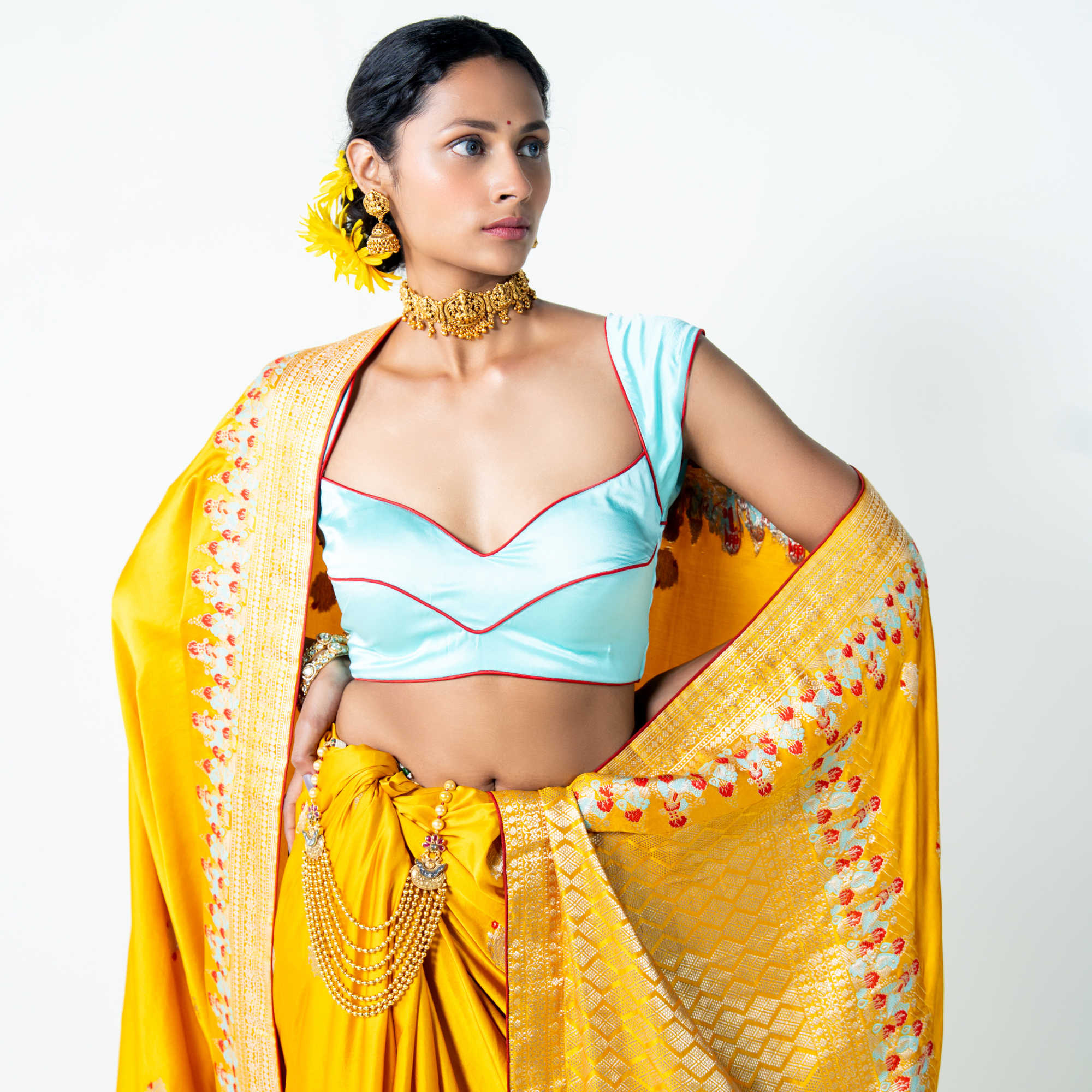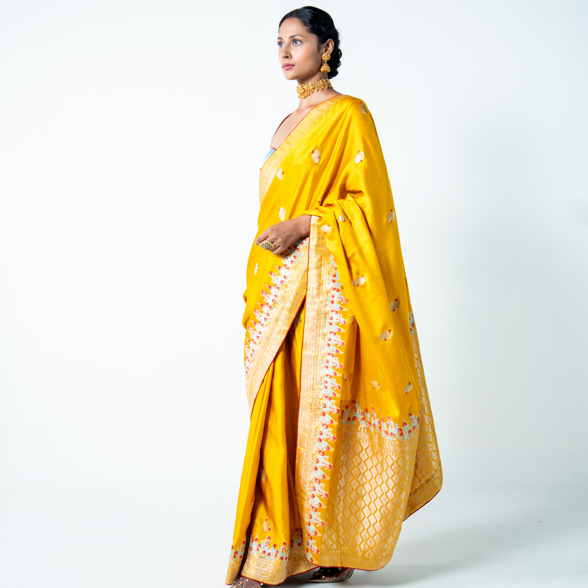 Bring home a radiant piece of Indian tradition with the Devshree Yellow Banarasi Saree. Handcrafted in luxurious Banarasi silk, this saree glows in a vibrant yellow hue that reflects positivity, joy, and celebration. Its delicate golden zari motifs and detailed pallu add an opulent touch, making it the perfect choice for festive mornings, haldi rituals, cultural ceremonies, and wedding functions.