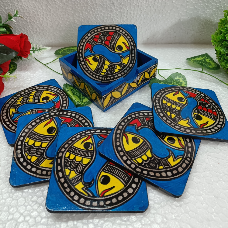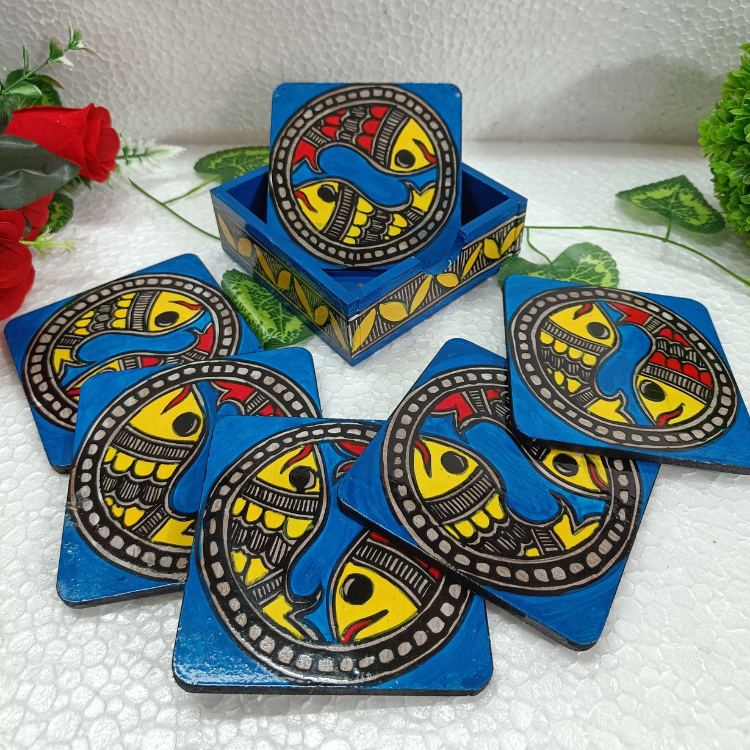 Add a touch of traditional elegance to your space with this beautifully handpainted Madhubani coaster set. Crafted on durable MDF wood, each coaster features intricate artwork inspired by folk art, bringing vibrant colors and cultural charm to your table. The set includes 6 coasters with a matching holder for neat storage. Perfect for protecting surfaces from heat and stains while enhancing your home décor, it also makes a thoughtful and artistic gift.