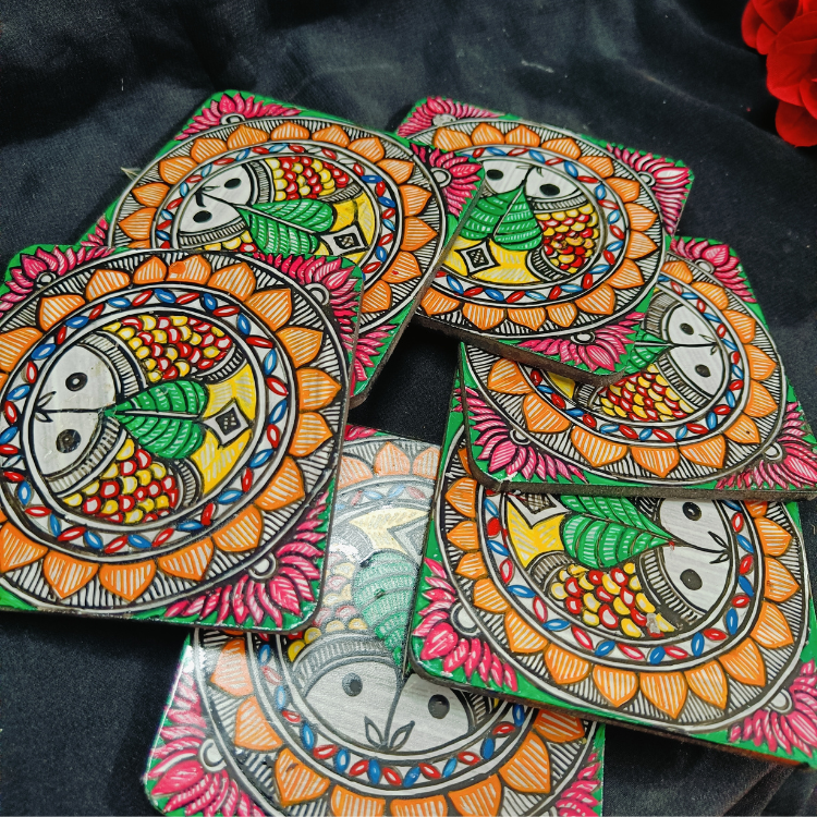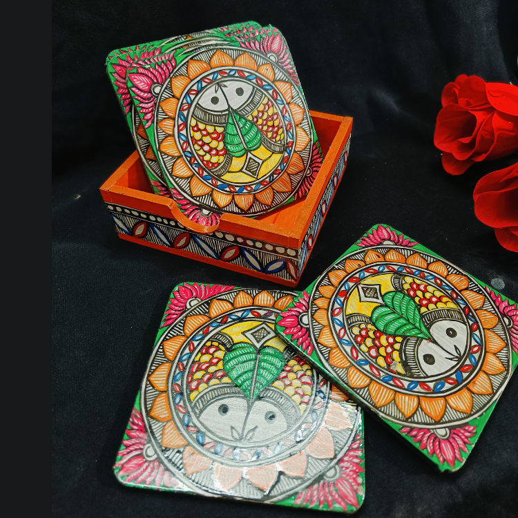 - Handcrafted Madhubani coaster set with vibrant, intricate motifs that celebrate traditional Indian art.