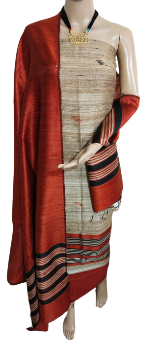 Dupion Silk Beige Dress Material with Maroon Dupatta