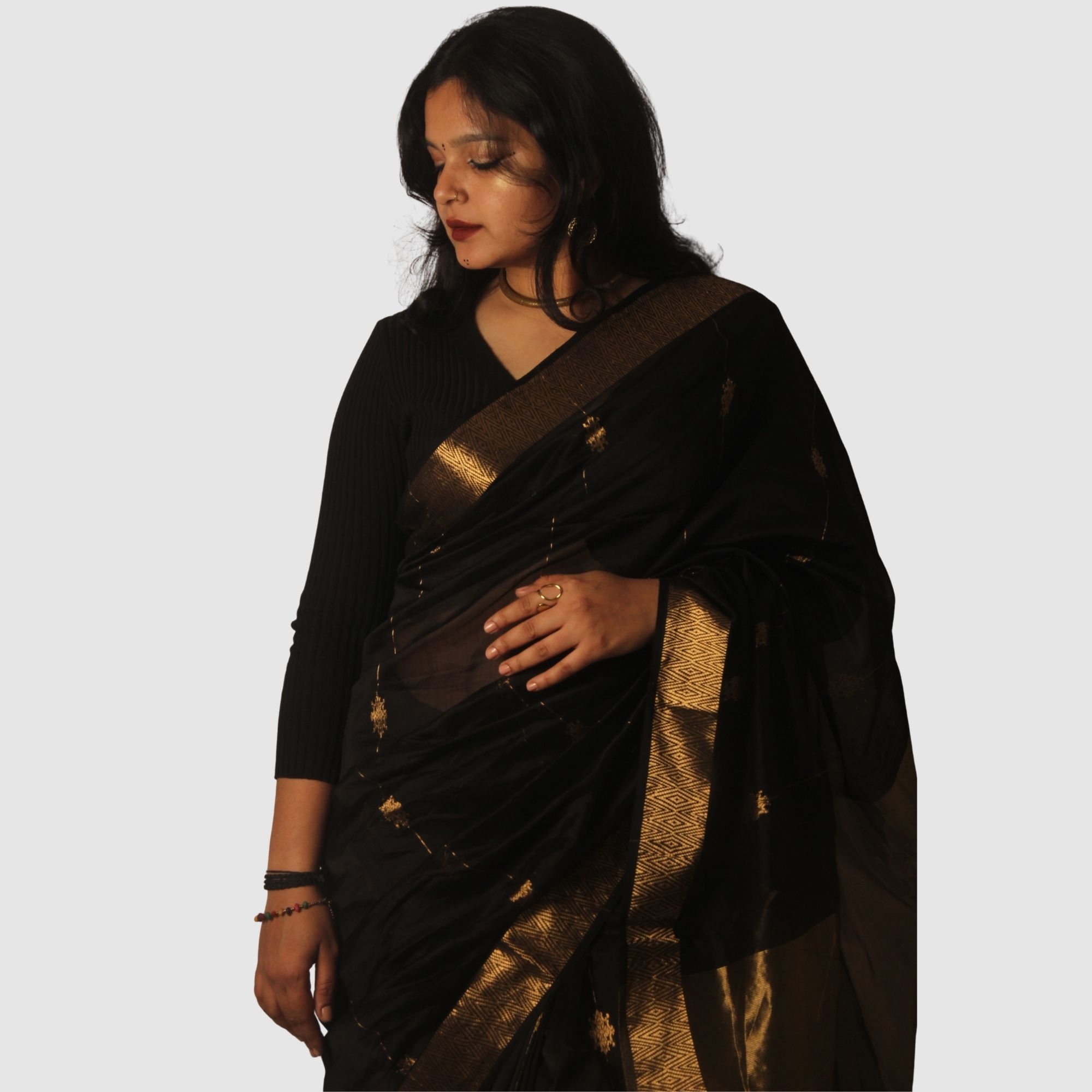 Elegant Black Maheshwari Silk Cotton Handloom Saree with Antique Gold Zari Border