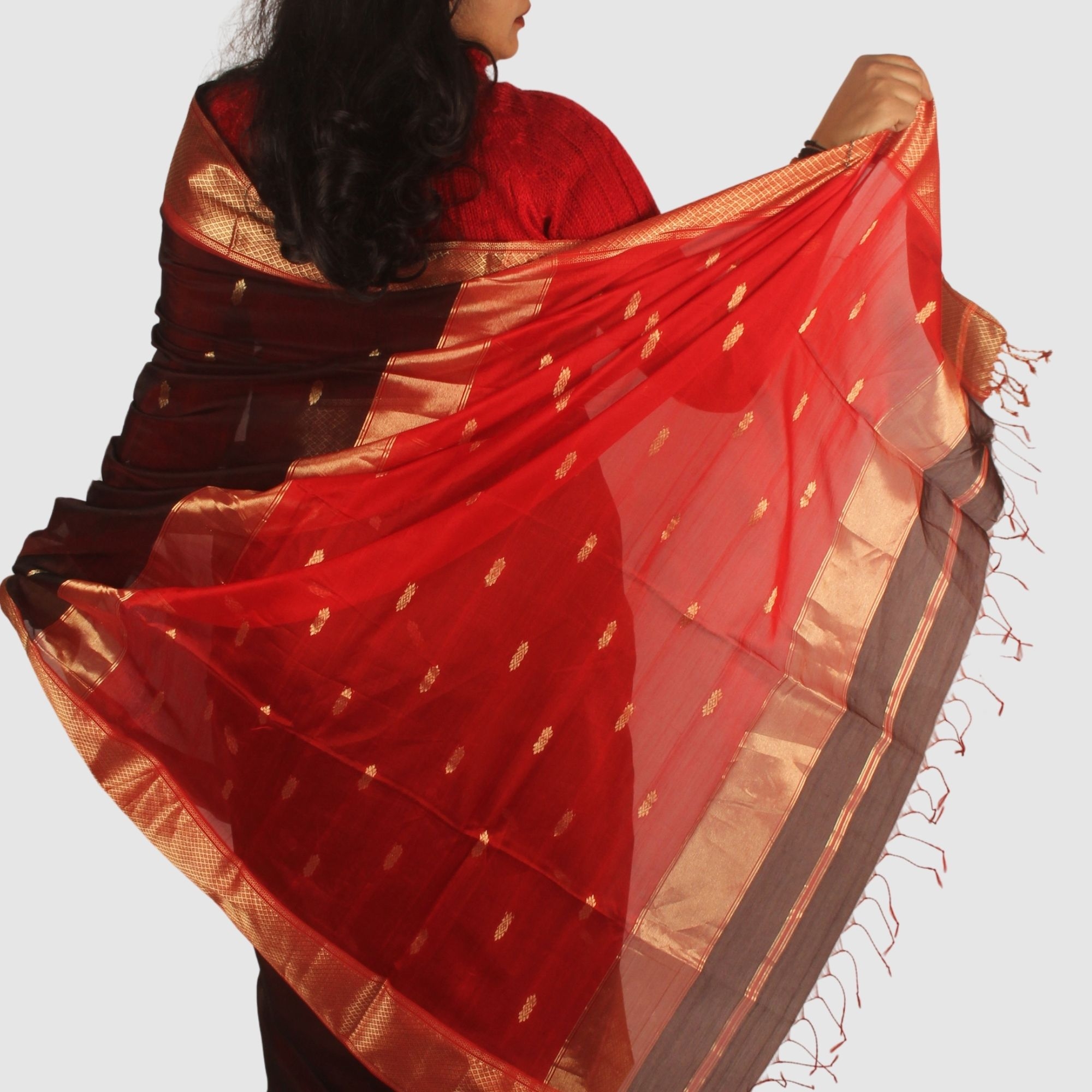 This elegant Maheshwari handloom saree is skillfully woven by artisans in Maheshwar, Madhya Pradesh. Designed in a beautiful crimson red and maroon combination, the saree features a classic antique gold zari border that enhances its traditional and festive appeal.